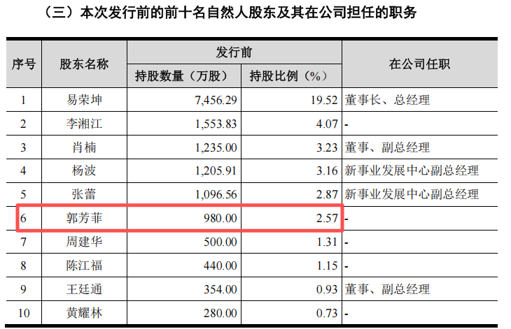 截至招股说明书签署日,郭芳菲位列恒坤新材前十名股东的第十位,位列前十名自然人股东的第6位。值得注意的是郭芳菲的股份全部来源于吕俊钦和李湘江!