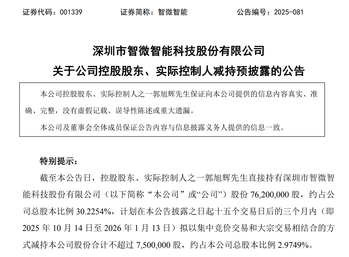近日,智微智能发布关于公司控股股东、实际控制人减持预披露的公告。公告显示,公司控股股东、实际控制人之一郭旭辉计划在公告披露之日(2025年9月12日)起十五个交易日后的三个月内(即2025年10月14日至2026年1月13日),以集中竞价交易和大宗交易相结合的方式减持公司股份合计不超过7,500,000股,约占公司总股本比例2.9749%。