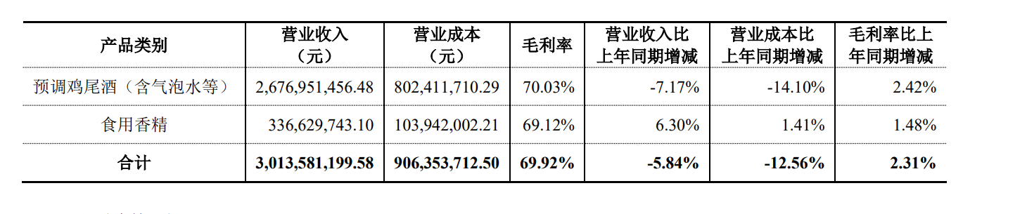 2024年,百润股份预调鸡尾酒(含气泡水等)实现26.77亿元的营业收入,同比下滑7.17%。今年上半年该公司实现营业收入14.9亿元,同比下滑8.56%,同期归母净利润为3.89亿元,同比下降3.32%。
