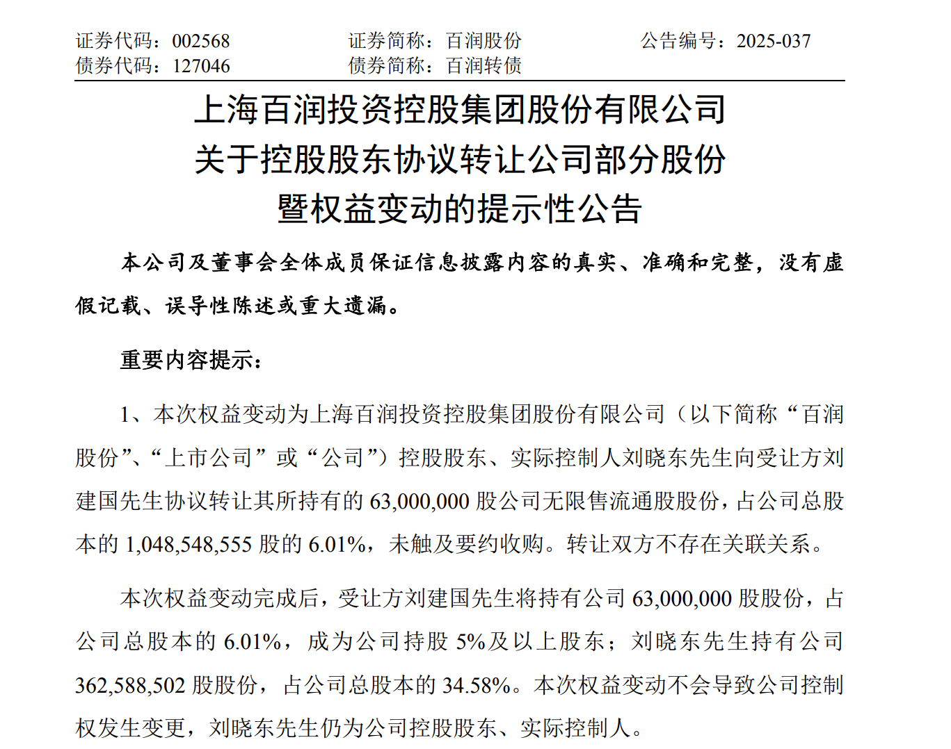 9月10日晚间,百润股份发布公告,称公司控股股东、实际控制人刘晓东向刘建国协议转让其所持有的6300万股无限售流通股股份,占公司总股本的6.01%。权益变动完成后,受让方刘建国将持有百润股份6.01%的股份,成为持股5%及以上股东。刘晓东则持有34.58%的股份,仍为公司控股股东。此次股份转让价格为23.337元,比9月10日收盘价25.24元折价7.54%。通过股权转让,刘晓东成功套现14.7亿元。