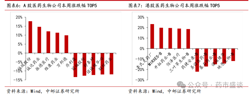 港股方面,上周个股涨幅前五位分别为:李氏大药厂(+23.38%)、MIRXES-B(+19.89%)、开拓药业-B(+19.64%)、佰泽医疗(+19.12%)、三叶草生物-B(+18.67%)。个股跌幅前五位分别为:药捷安康-B(-22.13%)、圣诺医药-B(-17.16%)、基石药业-B(-15%)、诺诚健华(-14.33%)、映恩生物-B(-11.9%)。