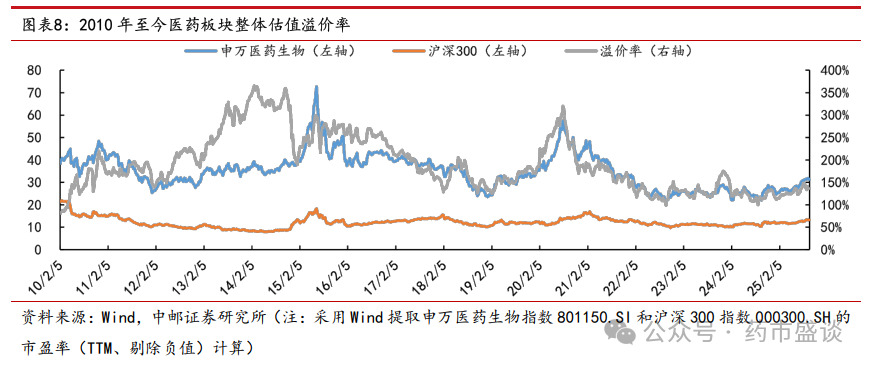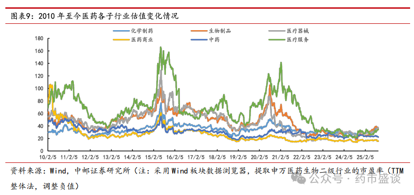 子行业市盈率方面,医疗器械、化学制药和生物制品板块居于前三位,本周医疗服务板块估值有所上升,生物制品和化学制药板块估值下降较大。