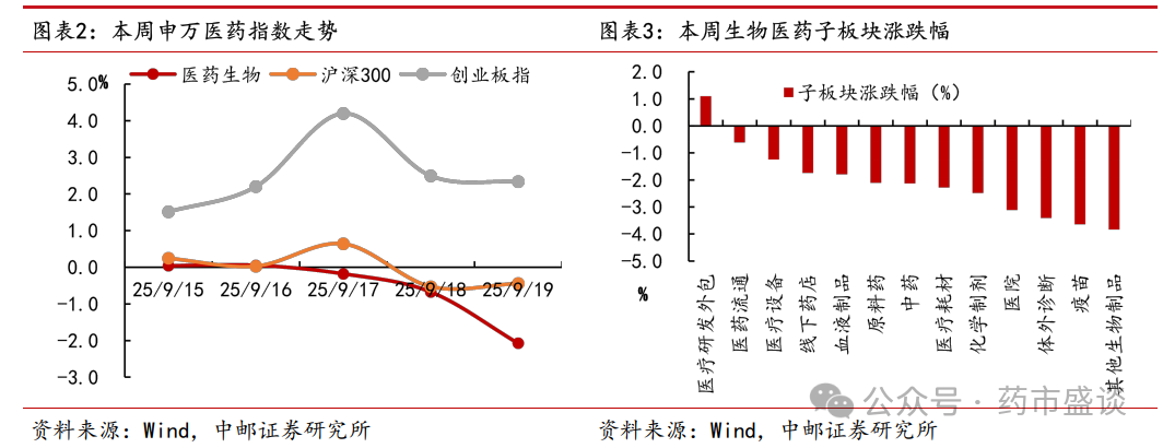 本周(2025年9月15日-9月19日),A股申万医药生物下跌2.07%,板块整体跑输沪深300指数1.63pct,跑输创业板指4.41pct。在申万31个一级子行业中,医药板块周涨跌幅排名为第25位。本周申万医药子板块中,仅医疗研发外包板块上涨,上涨1.09%;其他生物制品板块表现相对较差,本周下跌3.83%。
