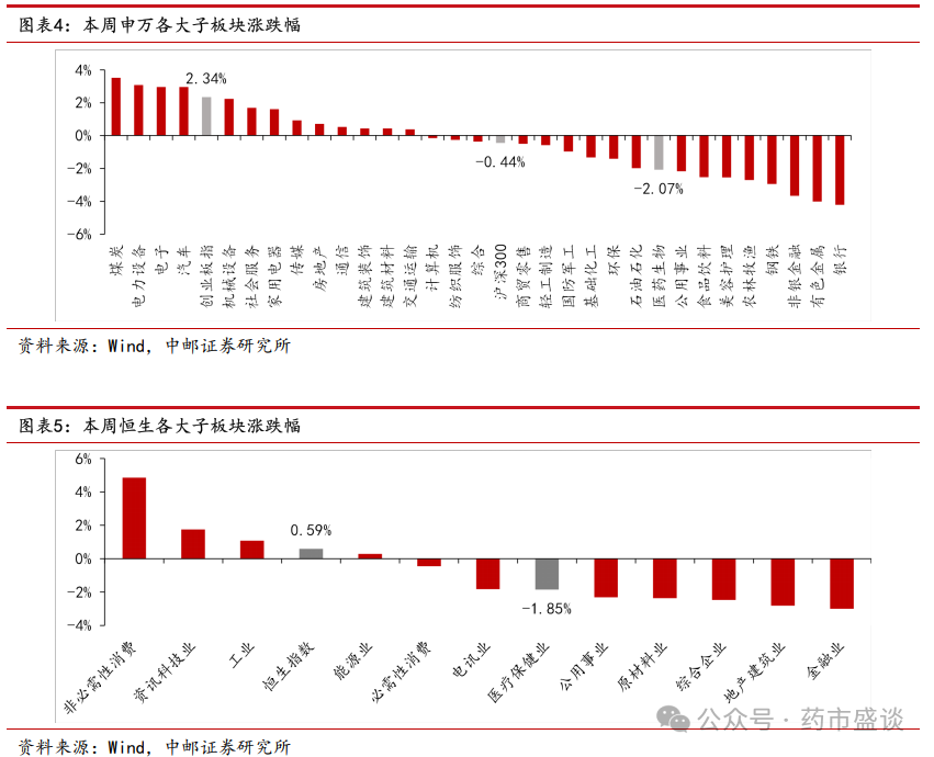 本周(2025年9月15日-9月19日),A股申万医药生物下跌2.07%,板块整体跑输沪深300指数1.63pct,跑输创业板指数4.41pct。在申万31个一级子行业中,医药板块周涨跌幅排名为第25位。恒生医疗保健指数下跌1.85%,板块整体跑输恒生指数2.44pct。在恒生12个一级子行业中,医疗保健行业周涨跌幅排名为第7位。