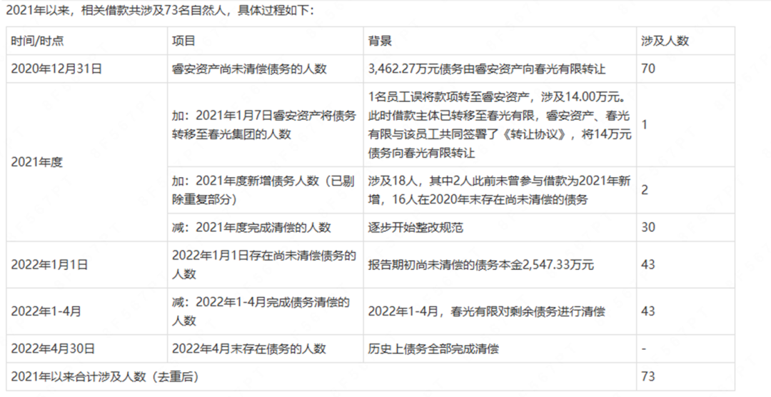 2016 年至 2020 年由睿安资产作为资金管理平台向内部员工、股东开放“集资”业务(即向相关个人 借款),实际执行中借款对象包括公司员工、股东或其亲属、朋友。截至2020年末,睿安资产尚未清偿的集资债务为3,462.27万元,涉及70人。