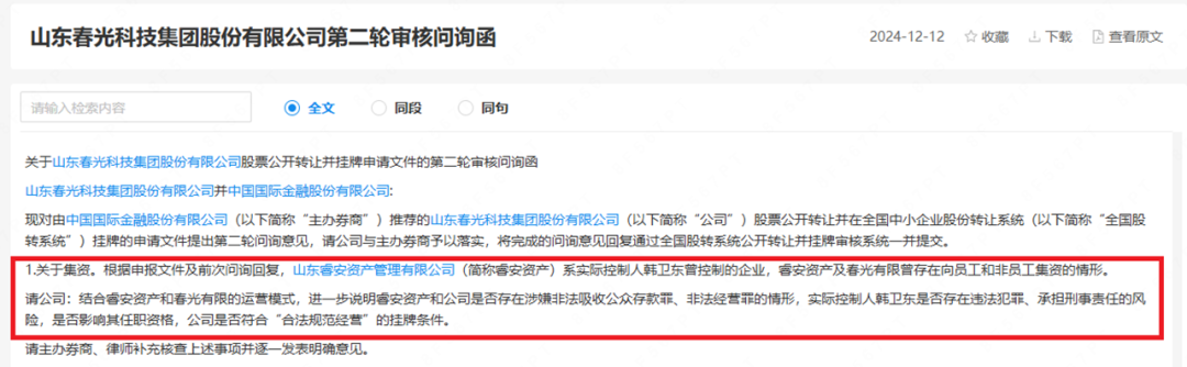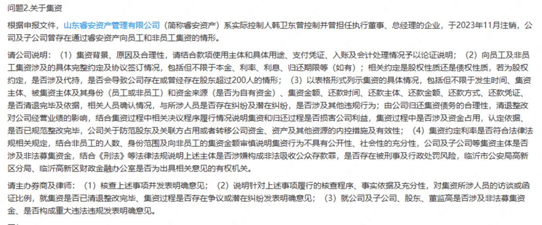 2024年11月,新三板在问询函中,第二个问题就春光股份过往集资历史发出问询。问询函称,山东睿安资产管理有限公司(简称睿安资产)系实际控制人韩卫东曾控制并曾担任执行董事、总经理的企业,于 2023 年 11 月注销,公司及子公司曾存在通过睿安资产向员工和非员工集资的情形。 交易所要求春光股份说明“集资约定利率是否符合法律法规相关规定,结合非员工的人数、身份范围及向非员工 的集资金额审慎说明集资行为不具有公开性、社会性的充分性,公司及子公司等集资 主体是否涉及非法募集资金,结合《刑法》等法律法规说明上述主体是否涉嫌构成非 法吸收公众存款罪,是否存在被刑事及行政处罚风险,临沂市公安局高新区分局、临沂高新区财政金融办公室是否为出具相关意见的有权机关”。