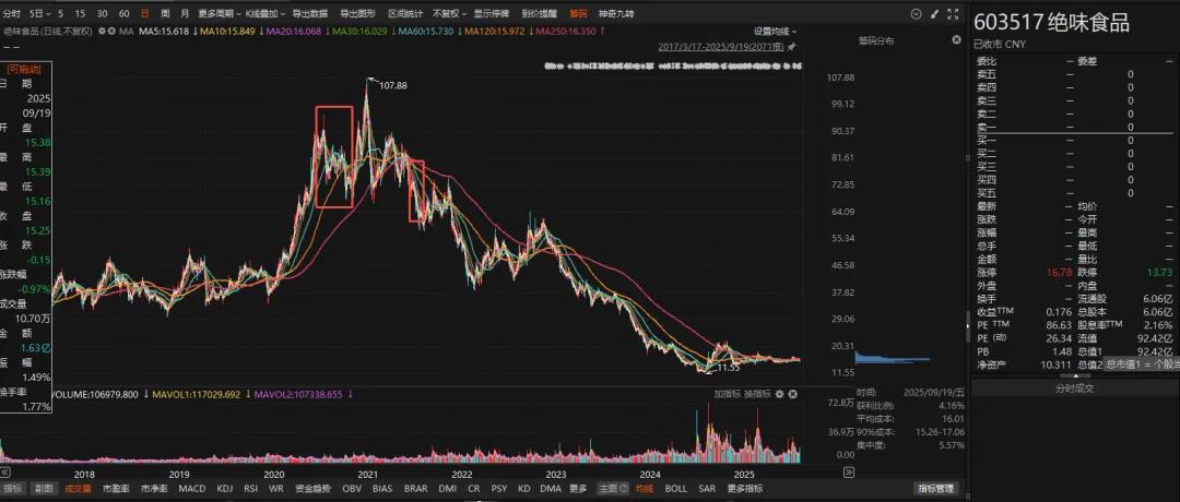 这里面跌最狠的也是绝味食品,高点股价102.37,现在只剩15.25元,再这样跌下去,股价就得打上一折了。