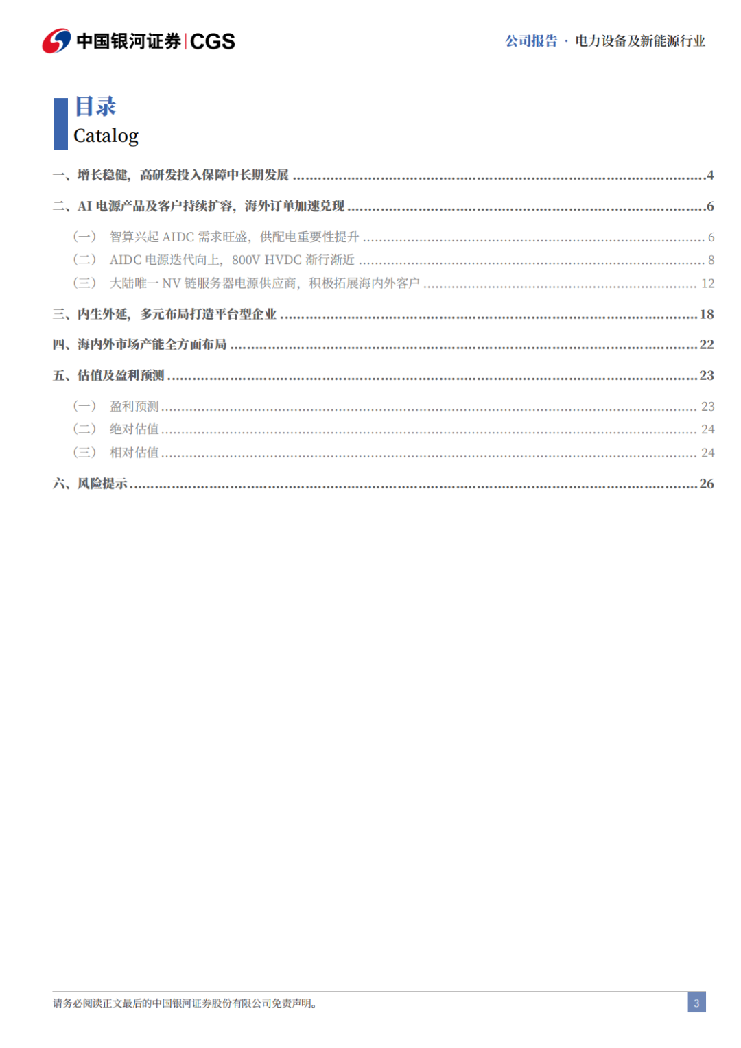 优先卡位英伟达,持续拓展海内外其他客户。公司己与英伟达形成合作伙伴关系,在服务器电源领域成为其指定的数据中心部件提供商之一,正积极参与英伟达 Blackwell 系列架构数据中心硬件系统的创新设计与合作建设。除英伟达外,2025年公司已同步在国内外全行业的上中下游全链条客户端做到了全面覆盖对接(即技术方案主导方、系统集成制造商、终端互联网云厂三端全覆盖),已获得部分国内外厂商的准入。我们认为公司AI服务器电源的多数客户需求及项目进度仍处于量产前的研发与调试阶段,小批量的AI服务器电源订单加速释放,随着公司持续深耕服务器电源国内和国外市场,不断推进产品的系统化和市场准入,收入放量在即。