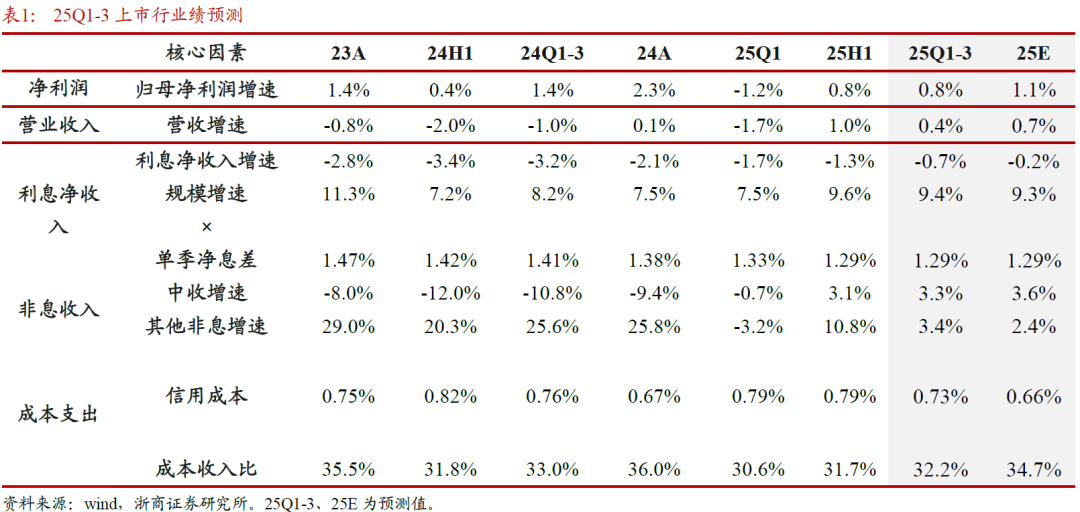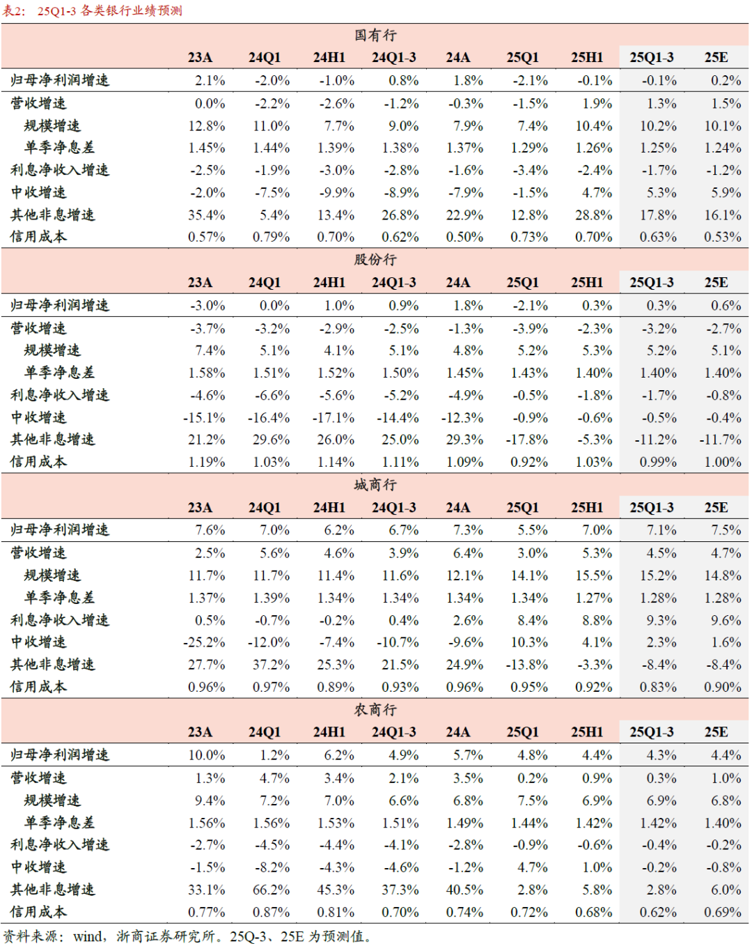 (1)规模增速放缓:预计25Q1-3上市行资产规模同比增长9.4%,较25H1放缓0.2pc,主要考虑有效信贷需求偏弱,银行扩表速度放缓。参考行业数据来看: 2025年8月末金融机构贷款增速较6月末下降0.28pc至6.78%,其中中小银行贷款增速放缓幅度较大,中资全国性大型银行、中资全国性中小银行8月末贷款增速较6月末分别下降0.24pc、0.35pc至9.00%、5.71%。