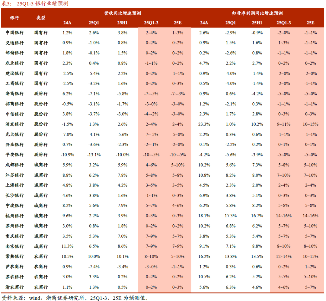 (2)分类判断:预计优质城商行业绩表现较强,2025年三季报营收和利润同比增速区间落在5-10%。预计25Q1-3国有行、股份行、城商行、农商行归母净利润增速分别较中报持平、持平、+0.1pc、-0.1pc至-0.1%、+0.3%、+7.1%、+4.3%,营收增速分别-0.5pc、-1.0pc、-0.9pc、-0.7pc至+1.3%、-3.2%、+4.5%、+0.3%。