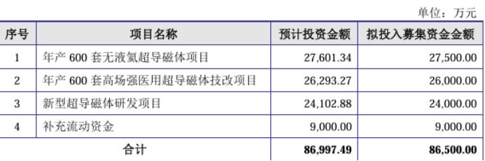 针对此次IPO,健信超导计划募集资金7.75亿元,其中2.75亿元用于年产600套无液氦超导磁体项目,2.6亿元用于年产600套高场强医用超导磁体技改项目,2.4亿元用于新型超导磁体研发项目。