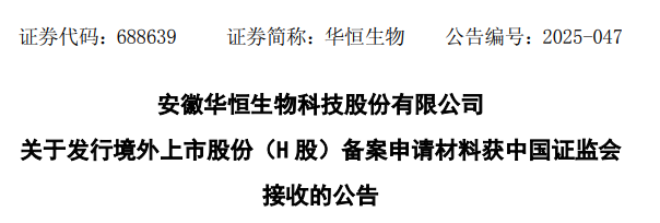 华恒生物(688639.SH)公告,公司已向中国证监会报送了香港发行上市的备案申请材料,并于近日获中国证监会接收。
