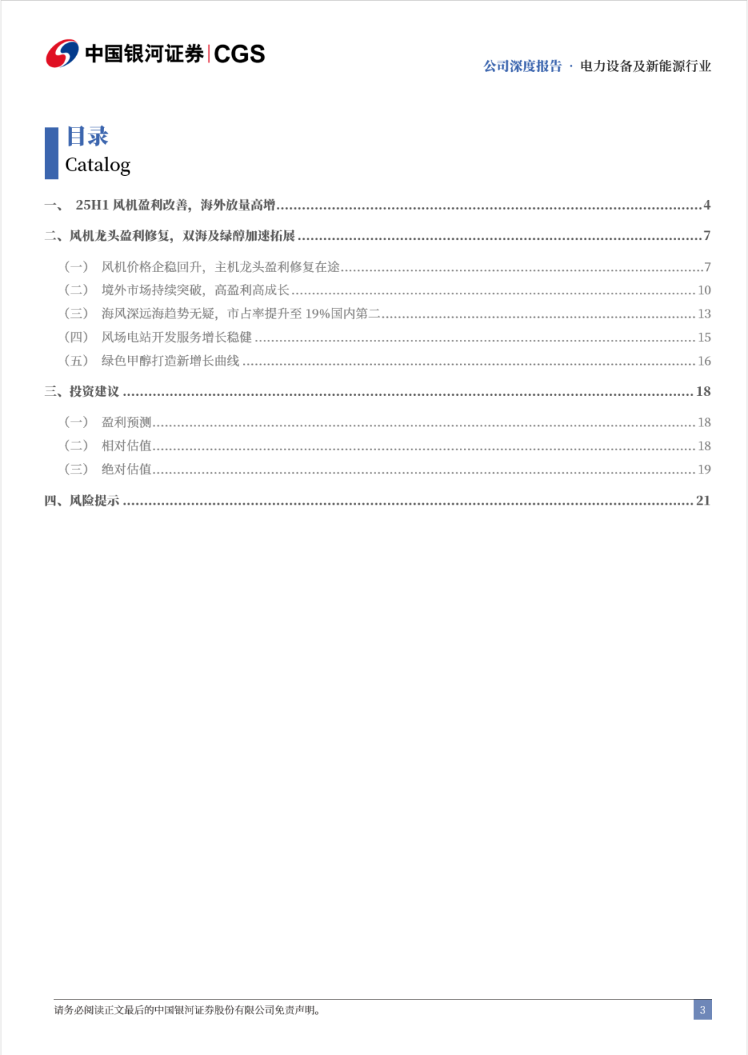 资料来源:CWEA,中国银河证券研究院主机厂盈利改善在途。主机厂商陆风几乎全线双馈,海风半直驱、双馈占比不断增大,叠加供应链优化、大型化以及零部件降本,海上订单放量以及2024年低价订单消化后,主机厂国内市场盈利有望提升。目前风电整机出海仍然初级阶段,海外风机价格高于国内,随着后期海外订单放量兑现,海外毛利率将有明显优势,带动整体盈利修复改善。25H1公司风机及零部件营收218.52亿元,同比+71.15%,占总收入的76.58%,毛利率提升4pcts至7.97%。