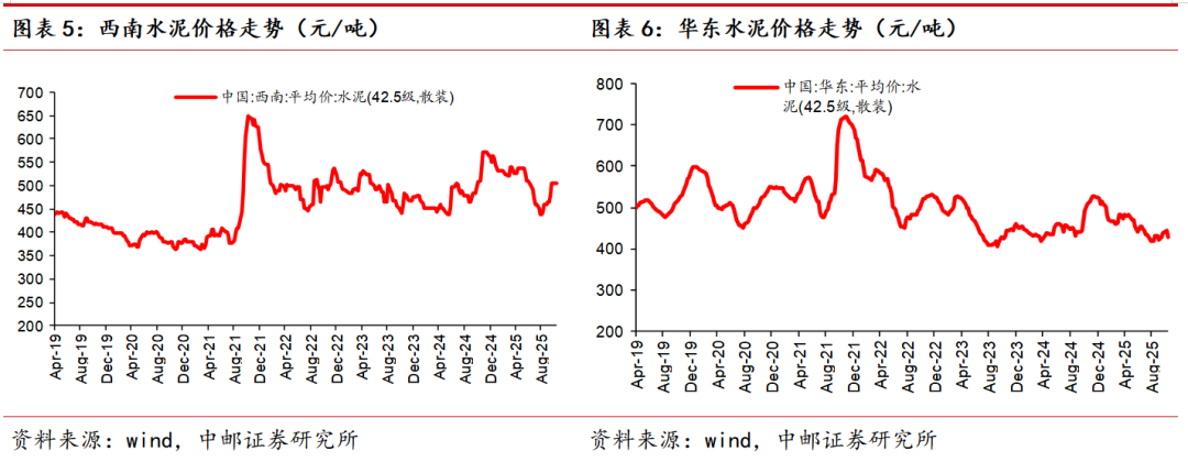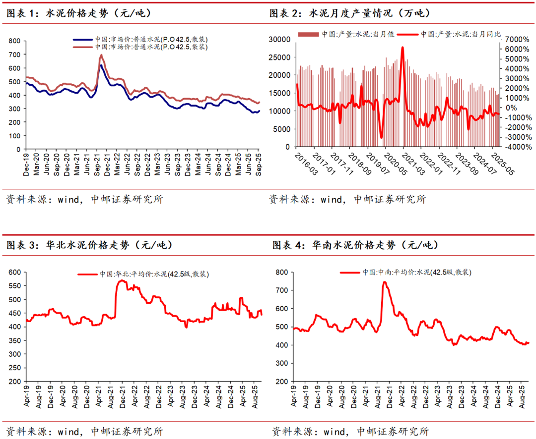 本周全国水泥市场价格环比下行,10月份整体需求呈现有所恢复但增长有限的特点,基建端,由于受到天气干扰、需求释放节奏等因素影响,其对需求并未完全显现,房建端,需求端仍然处于弱复苏态势。25年8月单月水泥产量为1.54亿吨,同比下滑8.6%。