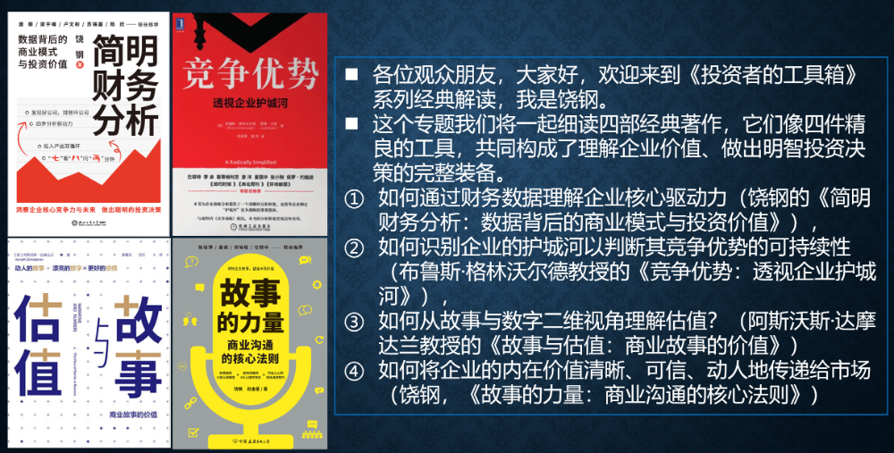 上周我到吴晓波频道录制一个读书节目,我的专题是《投资者的工具箱》,介绍4本书,两本是我的《简明财务分析》和《故事的力量》,另外两本是布鲁斯·格林沃尔德教授的《竞争优势:透视企业护城河》和阿斯沃斯·达摩达兰教授的《故事与估值:商业故事的价值》。
