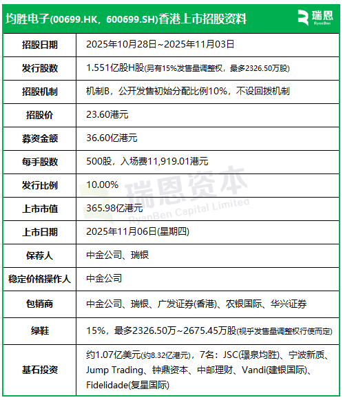 来自浙江宁波的A股上市公司均胜电子(00699.HK,600699.SH),于今日(10月28日)起至下周一(11月3日)招股,预计2025年11月6日在港交所挂牌上市,中金公司、瑞银联席保荐。