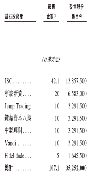 均胜电子是次IPO招股引入7名基石投资者,合共认购1.07亿美元(约8.32亿港元)的发售股份,基石投资者包括璟泉均胜旗下JSC、宁波高新技术产业开发区管委会旗下宁波新质、Jump Trading、钟鼎资本、中邮理财、建银国际旗下Vandi、复星国际旗下Fidelidade。
