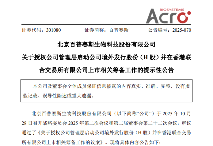 来自北京的A股上市公司百普赛斯(301080.SZ)发布公告称,为进一步推动国际化战略落地,加强海外业务布局,拓宽海内外并购和融资渠道,提高公司国际知名度,提高公司整体竞争力,根据公司总体发展战略及运营需要,公司拟在境外发行股份(H股)并在香港联合交易所有限公司上市。公司董事会同意授权公司管理层启动本次H股发行上市的相关前期筹备工作。