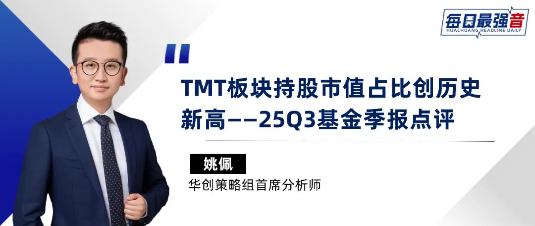 ①板块:主板占比回落,创业板、科创版占比上升。②大类行业:增配TMT、制造,减配消费、金融地产。25Q3主动偏股型基金TMT板块持股市值占比从25Q2的28.8%提升至25Q3的39.8%,制造板块持股市值占比从23.9%上升至24.2%;消费板块持股市值占比从25Q2的26.4%下降至25Q3的20.1%,金融地产板块持股市值占比从25Q2的7.5%下降至25Q3的3.9%。