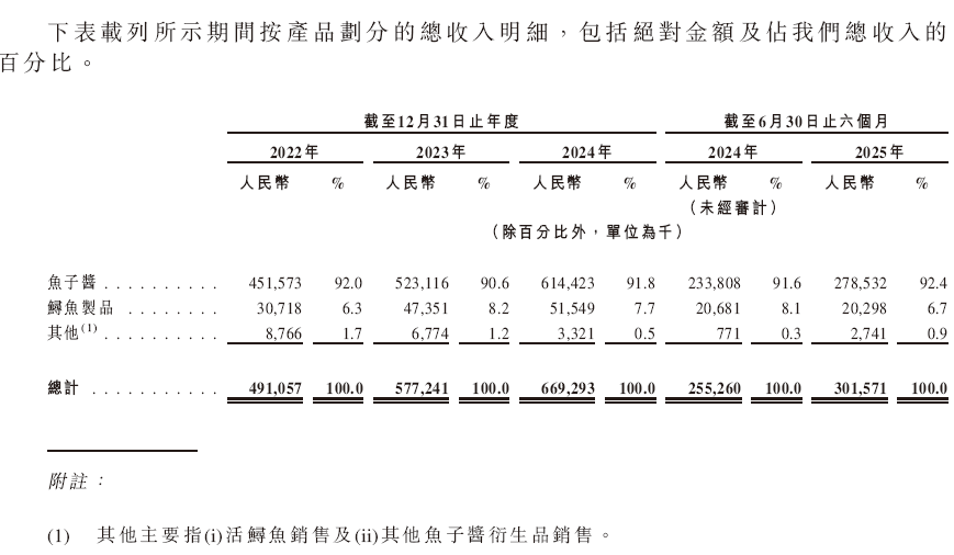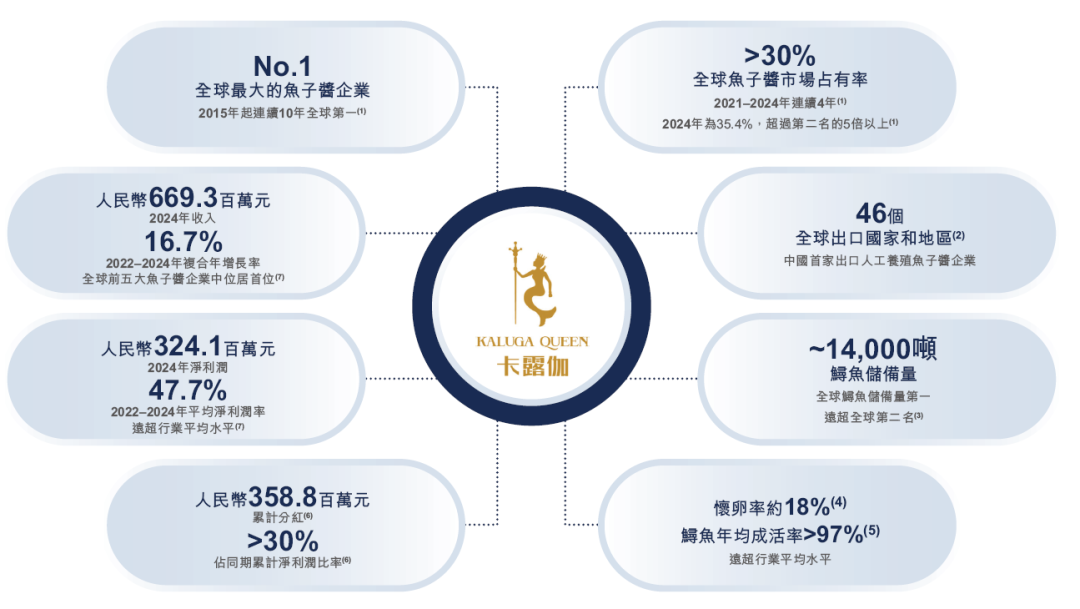 根据灼识咨询的资料,鲟龙科技自2015年以来连续10年实现鱼子酱销量全球第一名。2021年至2024年,鲟龙科技的鱼子酱销量持续占据全球市场的30%以上,于2024年达致35.4%,超过第二大企业的5倍以上。