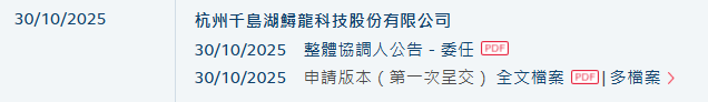 2025年10月30日,来自浙江杭州淳安县的杭州千岛湖鲟龙科技股份有限公司 Hangzhou Qiandaohu Xunlong Sci-tech Co., Ltd.(下称鲟龙科技)在港交所递交招股书,拟在香港主板上市。