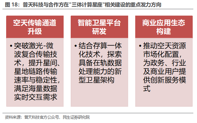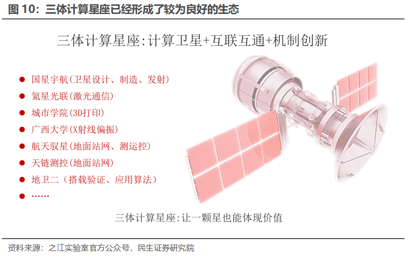 三体计算星座目前已经在空天计算领域形成了良好的生态,之江实验室和普天科技、国星宇航、氦星光联等多个合作方合作,共同推动三体计算星座的快速发展。1)三体计算星座计划构建一个覆盖全球的太空计算网络,通过星间激光高速互联、星座稳定组网、算力分布式调度,让数据在空中实时传输、运算,即时传回地球,打造开放共享的太空计算系统,构建天基智能计算基础设施,为未来的高级太空活动提供天基计算服务及大规模实时协同支持。2)之江实验室的两大重要参与者是浙江大学和阿里巴巴。中国工程院院士、全国政协委员、之江实验室主任、阿里云创始人王坚博士表示,人工智能跟制造业的结合是新的产业,将人工智能和航空航天产业结合则是发展的重要目标。