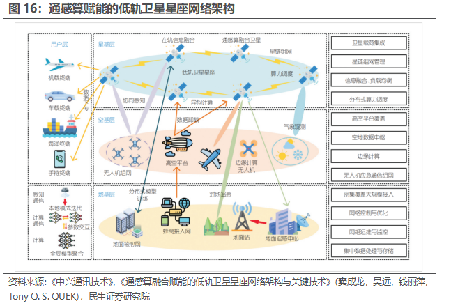 伴随着低轨卫星特别是计算卫星的发展,如何高效传输和处理海量感知数据,成为关键。根据《中兴通讯技术》发表的《通感算融合赋能的低轨卫星星座网络架构与关键技术》(窦成龙,吴远,钱丽萍,Tony Q. S. QUEK),通感算融合网络可以通过在低轨卫星星座网络有限的轨道资源内高效集成通信、感知和计算功能,可以极大地提升资源的利用效率,还为网络的综合服务能力提供了强有力的支撑;同时强化了网络的自主性和智能化水平,为未来空天地海一体化通信、多星组网遥感与在轨边缘计算等多维功能的协同演进打下了坚实基础。