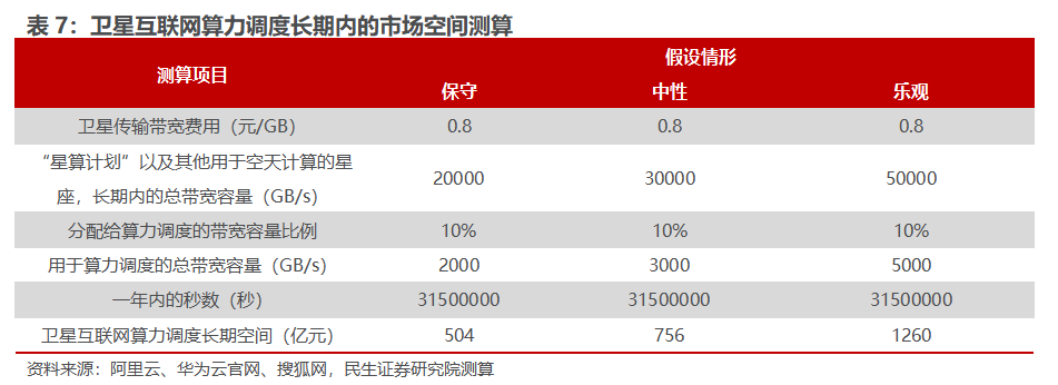 由于采用卫星互联网进行算力传输调度仍属于发展早期,因此我们从长期视角来考察相关空间。此处仅为对长期内行业空间的考察,并非对短期内所能实现的具体进展进行预测。