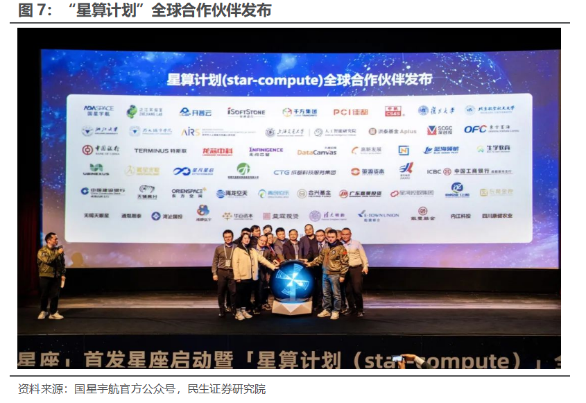 “星算计划”有望打造强大生态。1)“星算计划”发布:2024年11月,世界互联网大会乌镇峰会期间,国星宇航创始人陆川博士与合作伙伴在乌镇“三体计算星座”首发星座启动暨“星算计划star-compute”全球发布会上共同发布了“星算计划”。“星算计划”将助力我国在全球率先建成太空智算基础设施,将由2800颗算力卫星组网,构建未来算力网络。2024年9月,国星宇航成功发射全球首颗AI大模型科学卫星,并成功完成卫星在轨运行AI大模型技术验证。2)“星算计划”具有广泛的合作伙伴:国星宇航作为总体单位,与包括之江实验室、开普云、软通动力、千方科技、佳都科技、中国软件、复旦大学、北京航空航天大学、浙江大学、浙大城市学院、深圳市人工智能与机器人研究院、上海交大人工智能实验室、洪泰基金、深创投、东方富海、氦星光联、星移联信、天辅高分等首批54家公司、院校和机构建立全球合作伙伴关系。