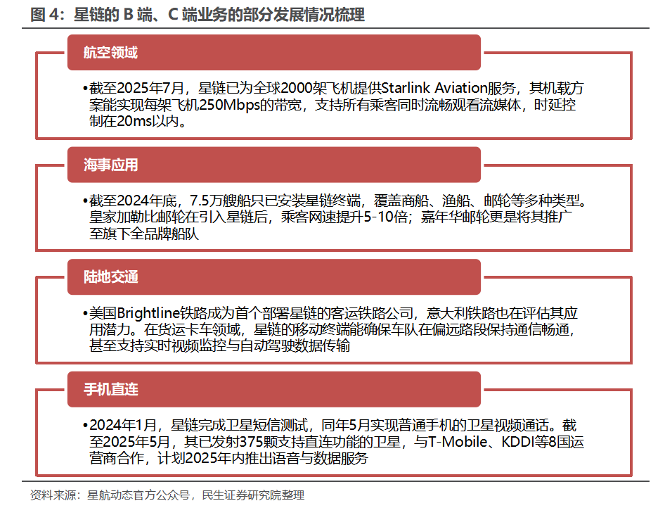 参考星链的B端、C端业务的发展,未来卫星互联网在长距离、低时延场景下具有重要潜力。在商业与行业应用领域,星链凭借低轨网络的移动性优势以及在时延方面的优势,在航空、海事、陆地交通等场景实现快速发展。