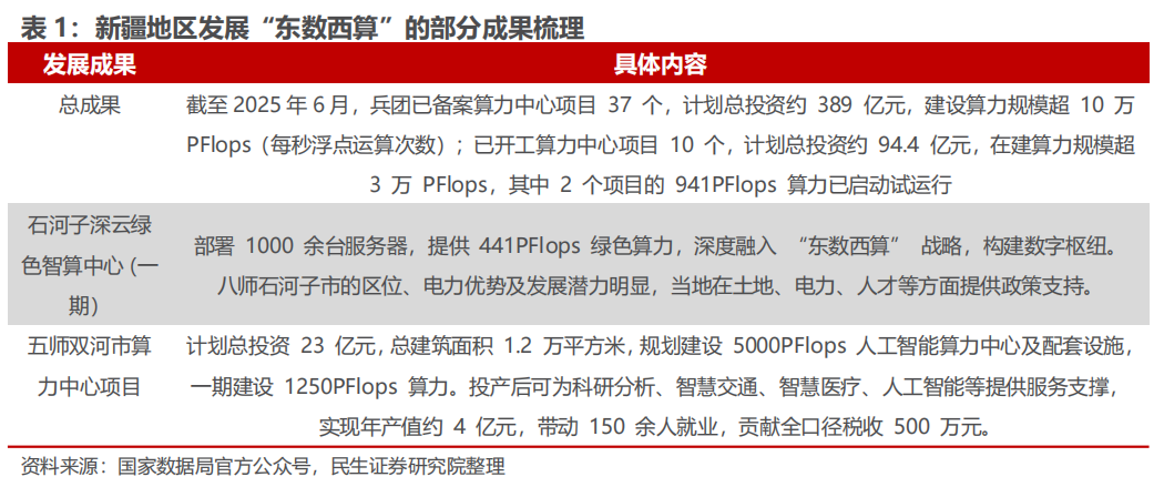 2)能源优势:兵团各垦区年均日照时长2600-3400小时,全年太阳能总辐射量每平方米5000-6490兆焦耳,光伏新能源可开发规模约2.1亿千瓦;截至2024年底,兵团已建成新能源装机规模1408.6万千瓦。依托清洁能源禀赋与区域独立电网优势,既能为算力提供充足绿电,又能维持较低电价。