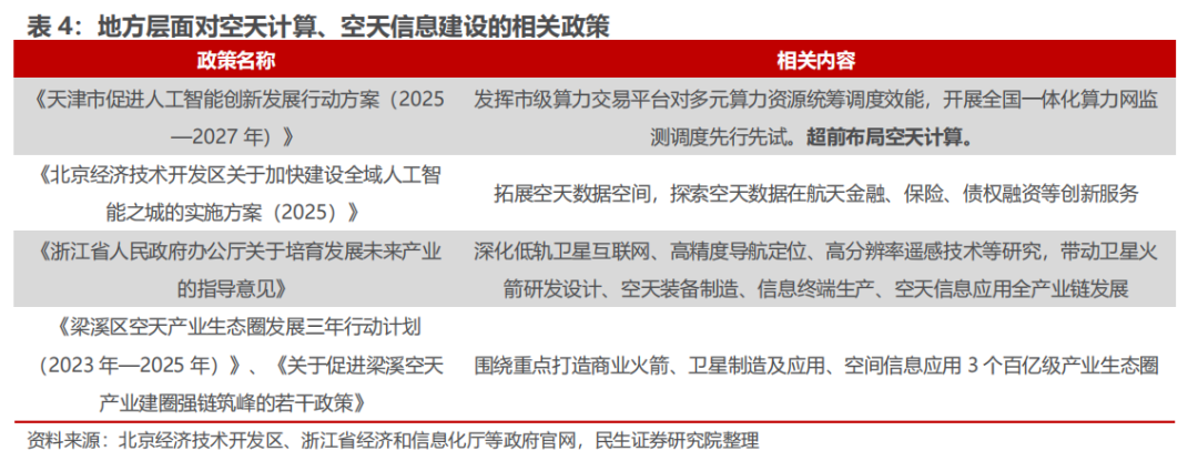 空天计算领域,地方结合自身禀赋打造差异化发展路径。2025年6月,天津发布《天津市促进人工智能创新发展行动方案(2025—2027年)》,其中在重点任务中提出超前布局空天计算。浙江省发布《浙江省人民政府办公厅关于培育发展未来产业的指导意见》,提出“深化低轨卫星互联网、高精度导航定位、高分辨率遥感技术等研究,带动卫星火箭研发设计、空天装备制造、信息终端生产、空天信息应用全产业链发展”。