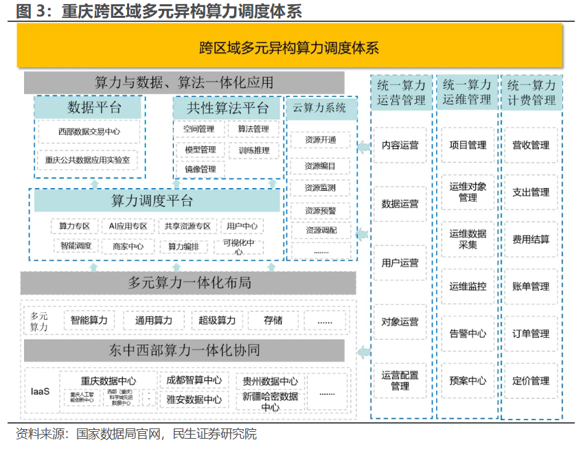 各地算力调度发展不断加速。1)贵州算力公司从贵州实际出发,着力打造全国一体化算力网络国家(贵州)枢纽节点调度平台(以下简称“调度平台”),汇聚全省算力资源,重点解决算力资源供需匹配不足、资源分散建设等问题,实现算力接入更可信、交易更便捷、调度更高效、服务更普惠,全面助力全国一体化算力网建设。2)重庆市建设了基于人工智能算法的跨区域多元异构算力调度体系,开展跨区域算力调度,降低企业数字化转型成本。一是开展跨区域算力资源调度合作。运用西部地区质优价廉的算力资源赋能重庆数字产业高质量发展,引入川、云、贵、甘、宁、疆等地富余算力,并带动在渝企业赴疆投资算力资源,推动算力与绿色电力一体化融合。二是建设算力调度平台。通过平台简单易用的操作,实现算力选购、算力下单、算力使用全流程。三是打通跨区域算力高速直连网络。创新运用国产自主视联网构建渝哈算力网主干道,时延约41毫秒,有效提升调度算力的稳定性和可用性。