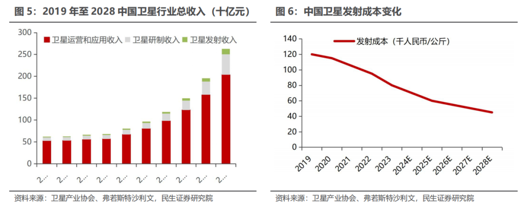 政策高度支持卫星互联网产业发展。1)2025年《政府工作报告》中提出“深入推进战略性新兴产业融合集群发展。开展新技术新产品新场景大规模应用示范行动,推动商业航天、低空经济等新兴产业安全健康发展”。2)2025年,国家互联网信息办公室、国家发展改革委、工业和信息化部、公安部、海关总署、市场监管总局、广电总局联合发布《终端设备直连卫星服务管理规定》,自2025年6月1日起施行。政策提出支持终端设备直连卫星技术研究、卫星通信与地面移动通信融合发展,探索技术融合新应用新业态,构建系统完备的产业体系。根据卫星产业协会、弗若斯特沙利文报告的数据,国内卫星产业将保持快速发展态势,同时卫星发射成本有望持续下降,给产业加速发展带来利好。