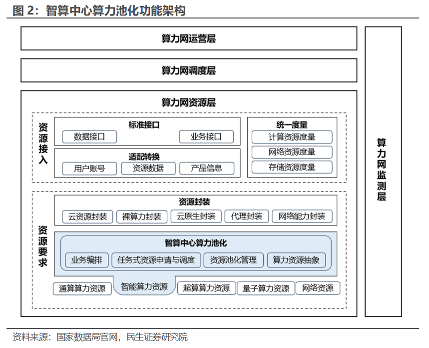 政策高度重视国内算力调度产业发展。2025年8月,全国数据标准化技术委员会秘书处面向社会公开征求《全国一体化算力网 智算中心算力池化技术要求》《全国一体化算力网 安全保护要求》2项技术文件意见。至此,全国一体化算力网9项技术文件已全部发布,全国一体化算力网标准体系建设基本完善。全国一体化算力网监测调度平台包括算力网运营层、算力网调度层、算力网资源层以及算力网监测层。其中算力网资源层通过资源并网将异属异构异地算力资源接入算力网,并依托于算力网服务用户业务需求。算力资源并网是通过网络连接实现算力资源的可达、可用,并通过API接口实现算力资源的管理、调度与计量。