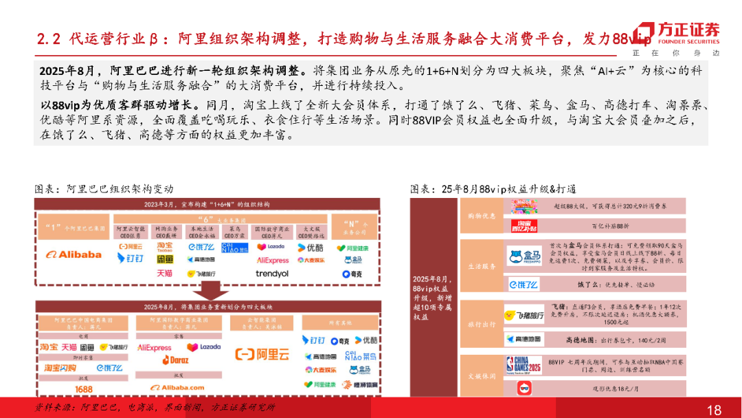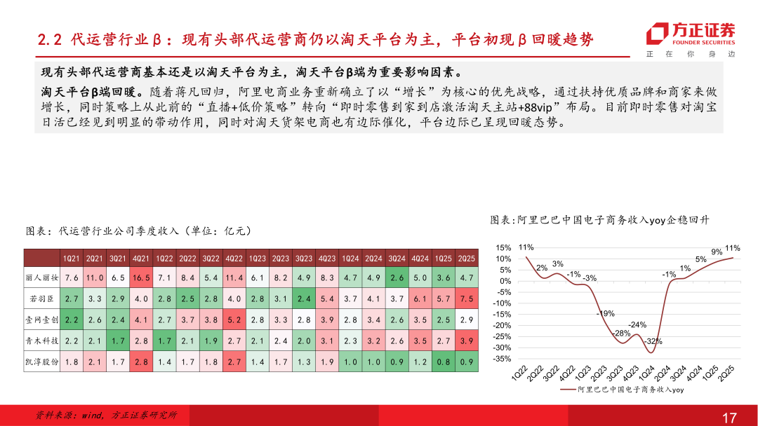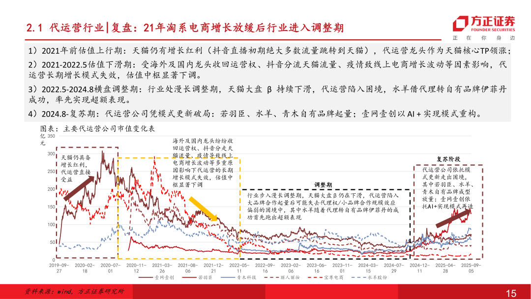 代运营行业:行业经历3-4年的调整,逐步从自有品牌/AI+两条路径开启转型。24年底蒋凡回归后阿里电商业务重新确立了以“增长”为核心的优先战略,通过扶持优质品牌和商家来做增长,同时策略上从此前的“直播+低价策略”转向“到家到店激活淘天主站+扩大88vip核心客群”布局,整体淘天平台β有所回暖。同时阿里在国内云厂商中对AI投入领先,目标3年3800亿元capex,其中AI电商为阿里云重要发力&变现场景,阿里联合生态服务商共建AI Agent能力,代运营行业有望受益。