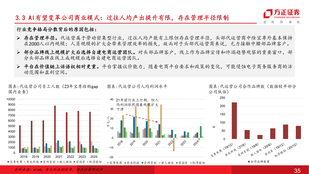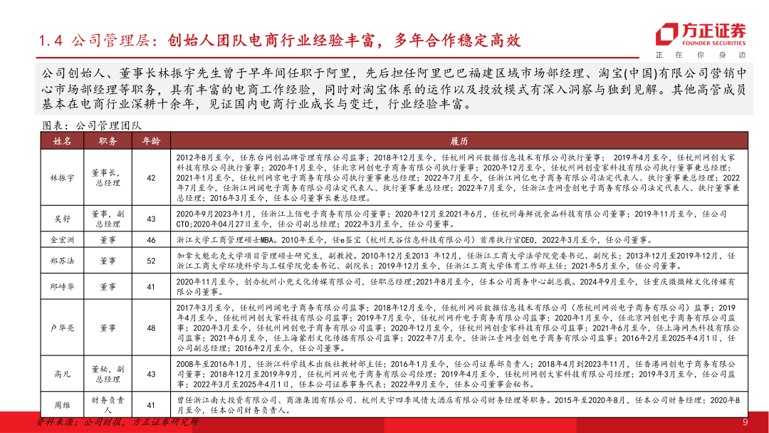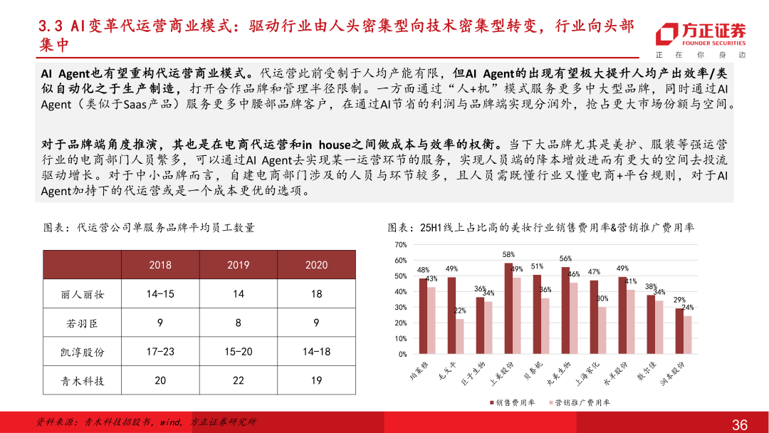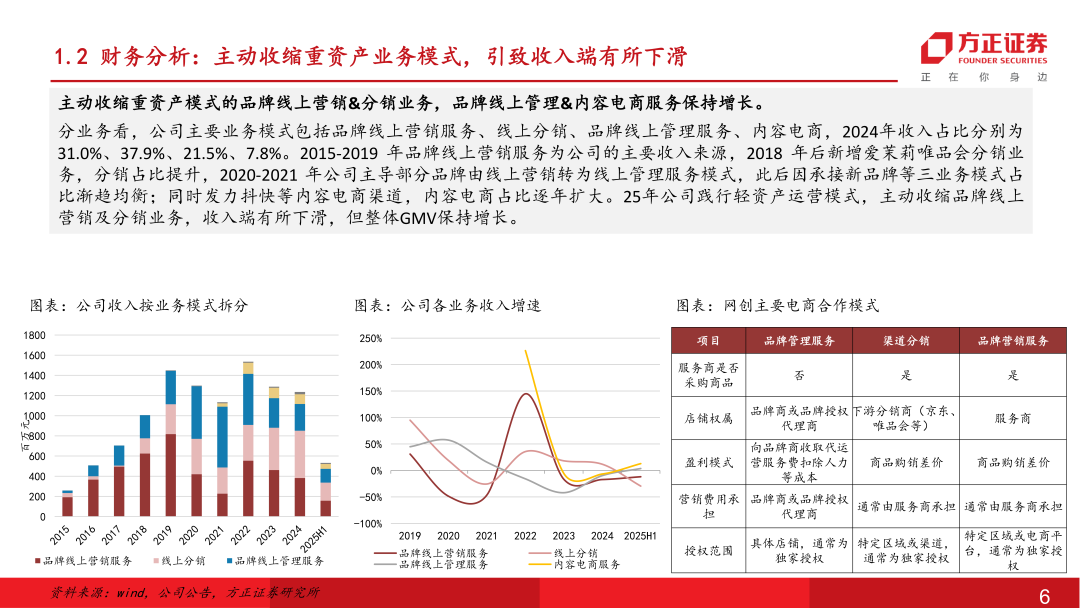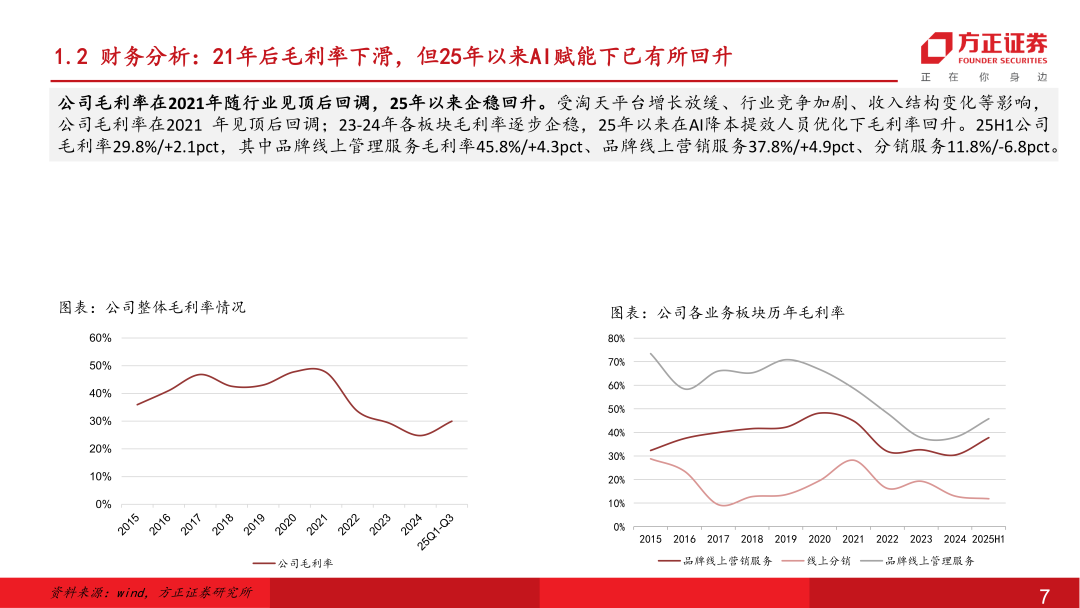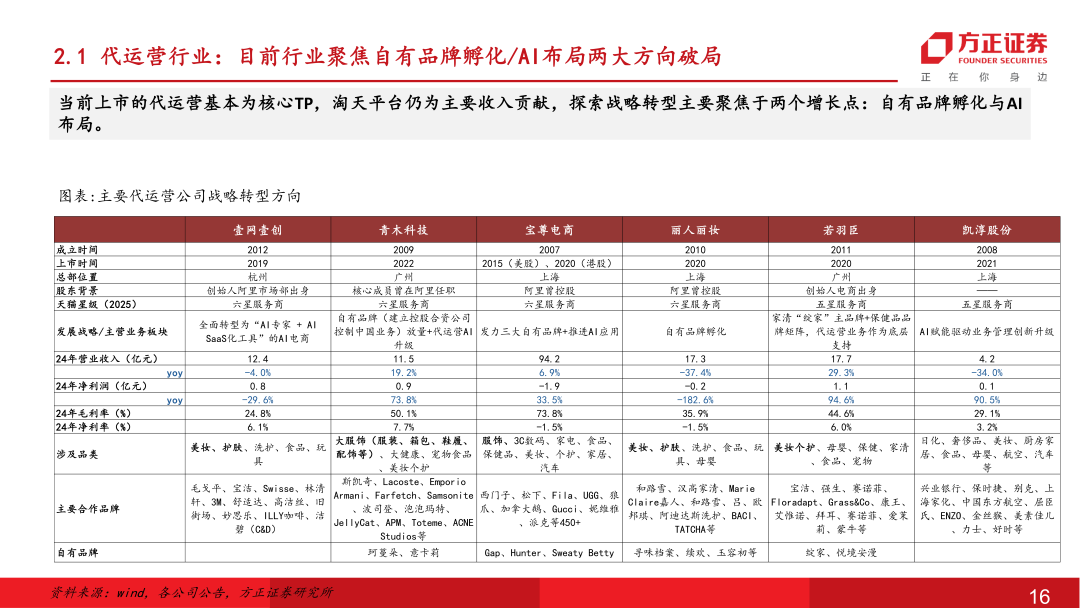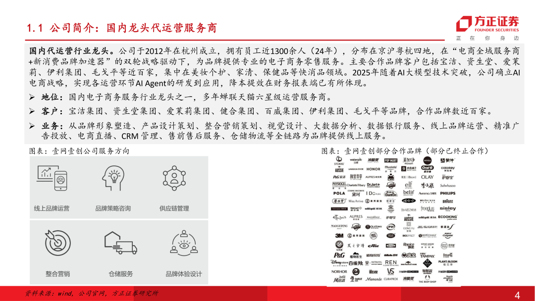 国内龙头电商代运营服务商。公司于2012年在杭州成立,拥有员工近1300余人(24年),分布在京沪粤杭四地,在“电商全域服务商+新消费品牌加速器”的双轮战略驱动下,为品牌提供专业的电子商务零售服务。主要合作品牌客户包括宝洁、资生堂、爱茉莉、伊利集团、毛戈平等近百家,集中在美妆个护、家清、保健品等快消品领域。2025年随着AI大模型技术突破,公司确立AI电商战略,实现各运营环节AI Agent的研发到应用,降本提效在财务报表端已有所体现。