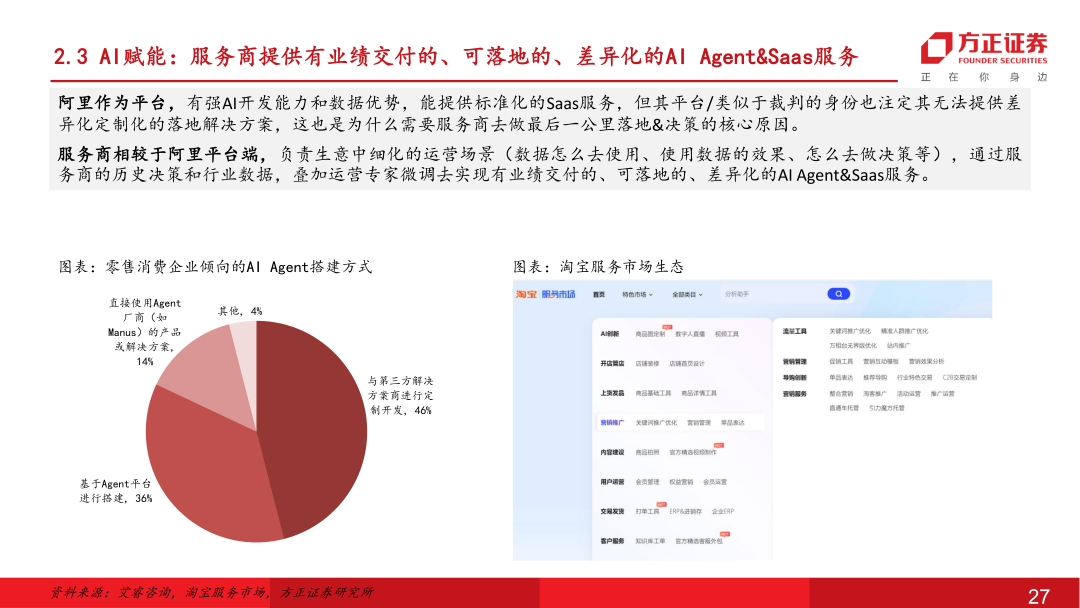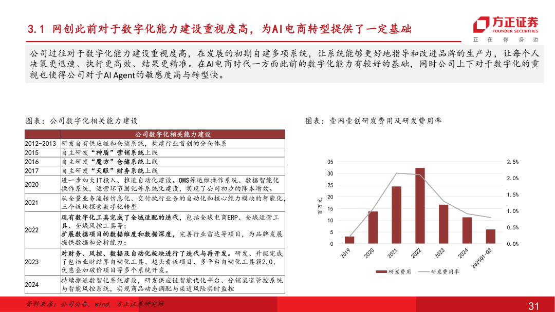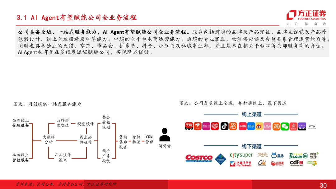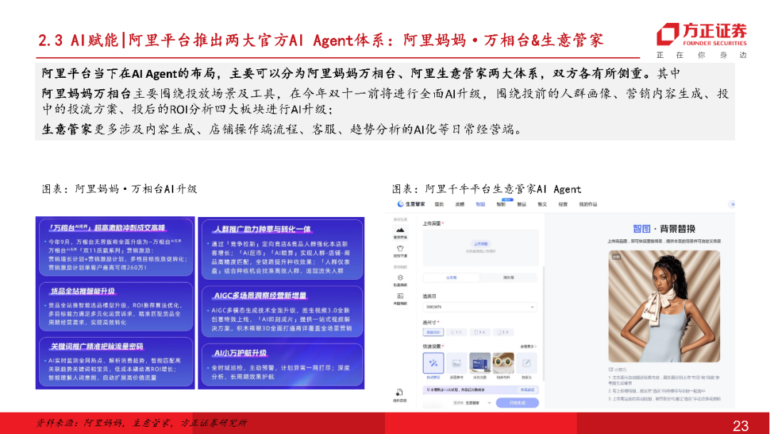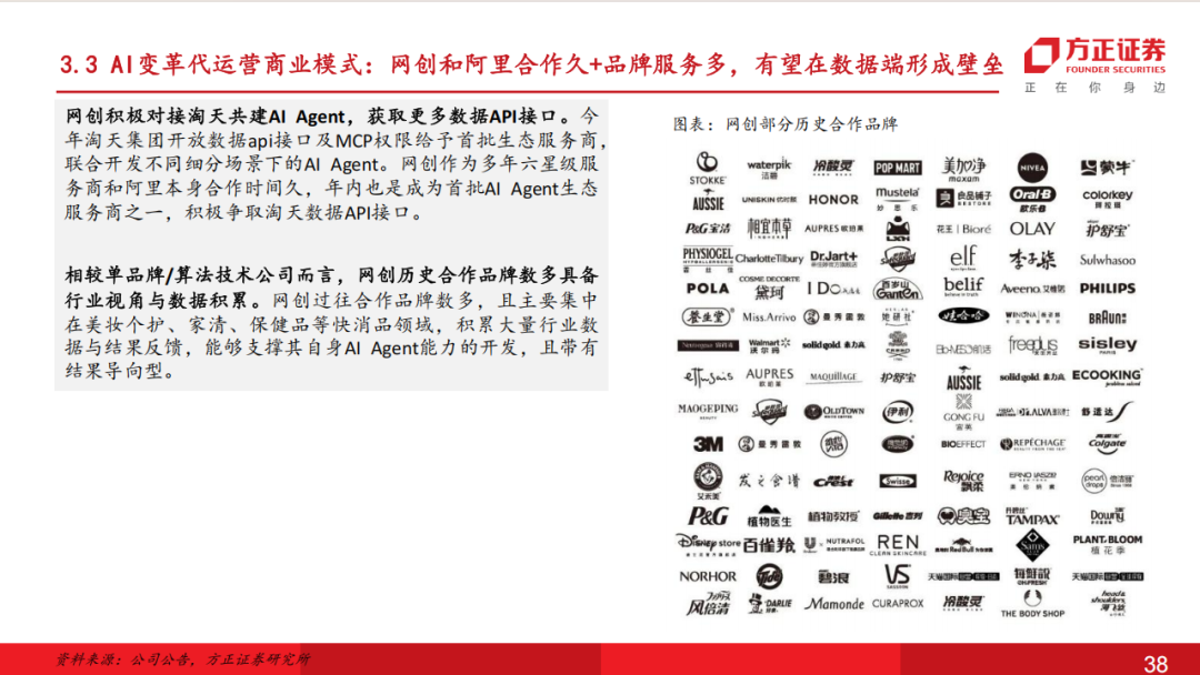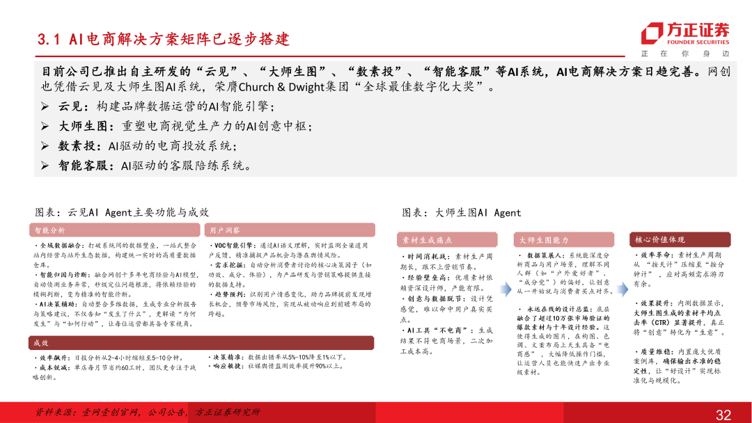 网创AI电商战略转型明确,利润端已现改善静待后续收入端扩张:公司聚焦头部生态资源共建,与阿里深度推进AI共创项目,依托六星级服务商在阿里生态积攒的底蕴,以丰富独到的场景解构能力成功入选阿里首批Agent共创名单,整体公司上下推进AI电商战略转型明确。目前公司已推出自主研发的云见、大师生图、数素投、智能客服等AI系统,AI电商解决方案日趋完善,降本提效成效在25年内已初步显现。后续也有望驱动公司由人头密集型向技术密集型转变,通过“人+机”模式扩展中大型品牌客户垂类需求、AI Agent Saas化对接更多腰尾部客户,提升市场份额打开成长天花板,在25年双十一后有望见到更多品牌客户合作对接,26年实现规模增长。