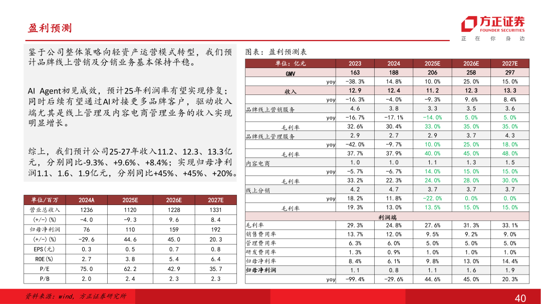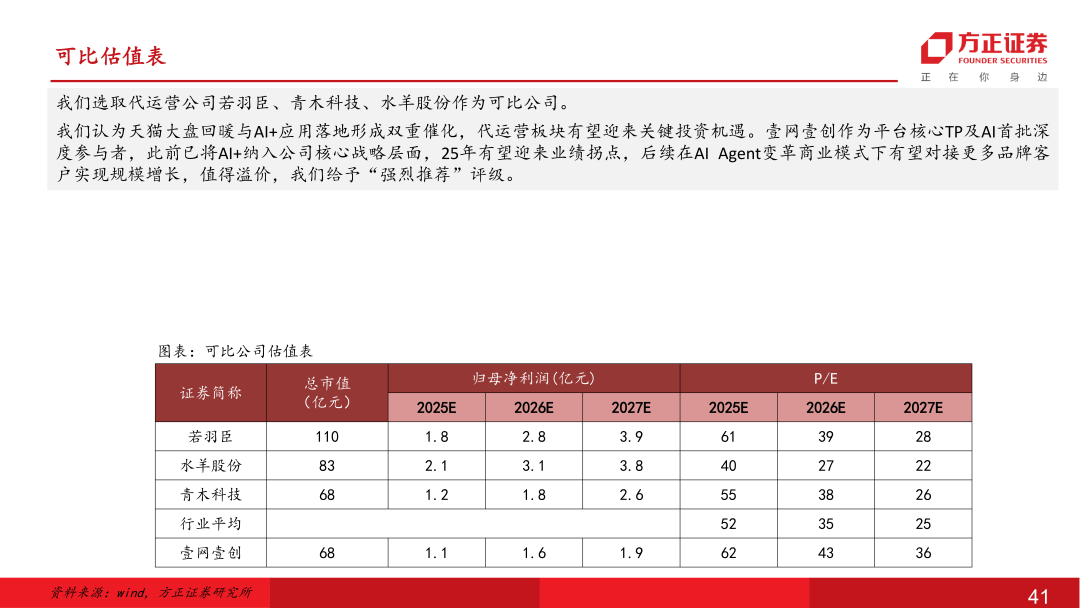 盈利预测与投资建议:天猫大盘回暖与AI+应用落地形成双重催化,代运营板块有望迎来关键投资机遇。壹网壹创作为平台核心TP及AI首批深度参与者,此前已将AI+纳入公司核心战略层面,25年有望迎来业绩拐点,后续在AI Agent变革商业模式下有望对接更多品牌客户实现规模增长。我们预计公司25-27年公司归母净利润1.1、1.6、1.9亿元,给予“强烈推荐”评级。