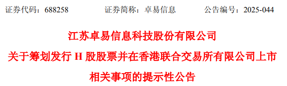 来自江苏宜兴的A股上市公司卓易信息(688258.SH)发布公告称,为充分借助国际资本市场的资源优化资本结构,拓宽融资渠道,进一步推进公司全球化发展战略及海外业务布局需要,提升品牌影响力与核心竞争力,巩固行业领先地位,全面提升公司综合实力,公司正在筹划发行境外股份(H股)并在港交所上市事宜。