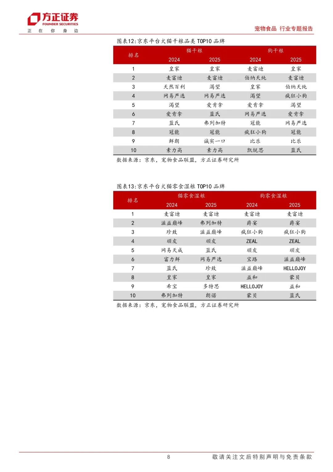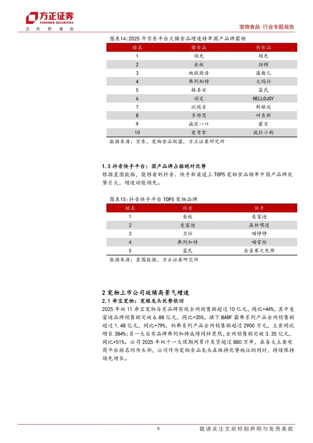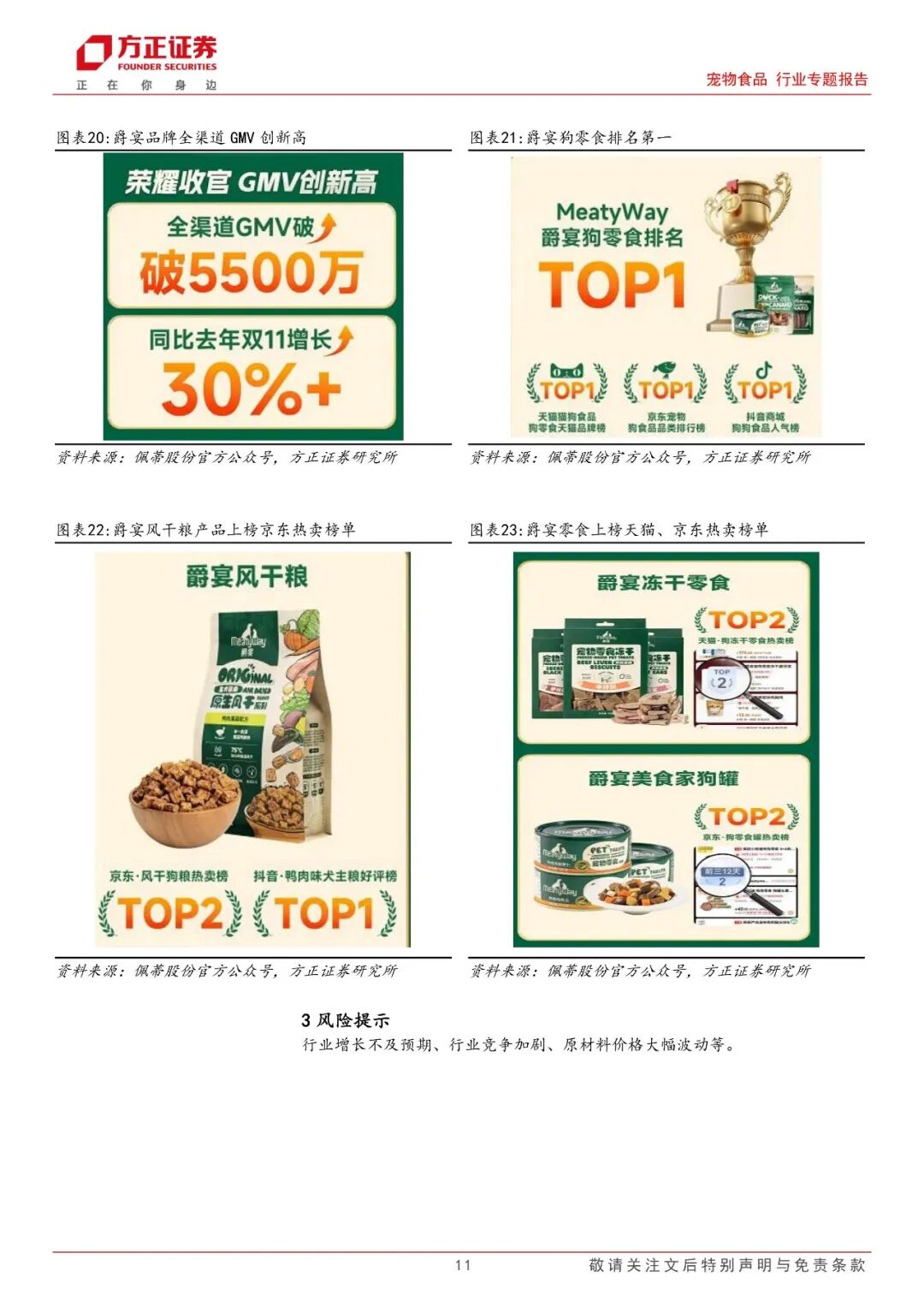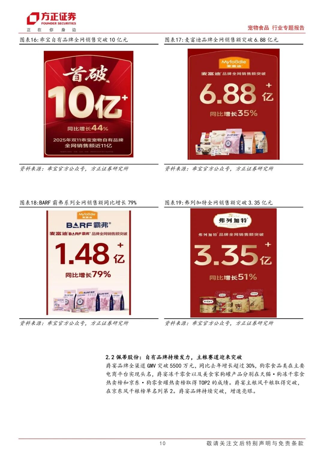 宠物上市公司延续高景气增速。乖宝宠物:宠粮龙头优势依旧。2025年双11乖宝宠物自有品牌实现全网销售额超过10亿元,同比+44%,其中麦富迪品牌销售额突破6.88亿元,同比+35%,旗下BARF霸弗系列产品全网销售额超过1.48亿元,同比+79%,奶弗系列产品全网销售额超过2900万元,主食同比增长384%;另一大自有品牌弗列加特成绩同样斐然,全网销售额突破3.35亿元,同比+51%。公司2025年双十一大促期间累计发货超过880万单,在各大主要电商平台排名均为头部,公司作为宠物食品龙头在维持优势地位的同时,持续保持领先增长。佩蒂股份:自有品牌持续发力,主粮赛道迎来突破。爵宴品牌全渠道GMV突破5500万元,同比去年增长超过30%,狗零食品类在主要电商平台实现头名,爵宴冻干零食以及美食家狗罐产品分别在天猫·狗冻干零食热卖榜和京东·狗零食罐热卖榜取得TOP2的成绩。爵宴主粮风干粮取得突破,在京东风干粮榜单名列第2。爵宴品牌持续突破,增速亮眼。