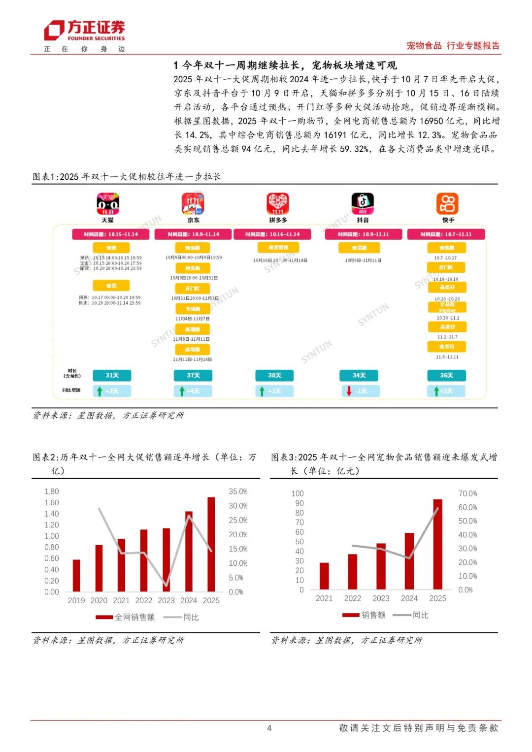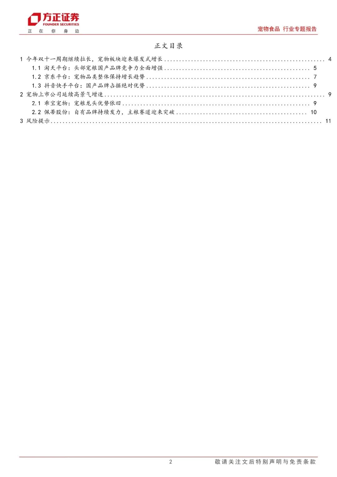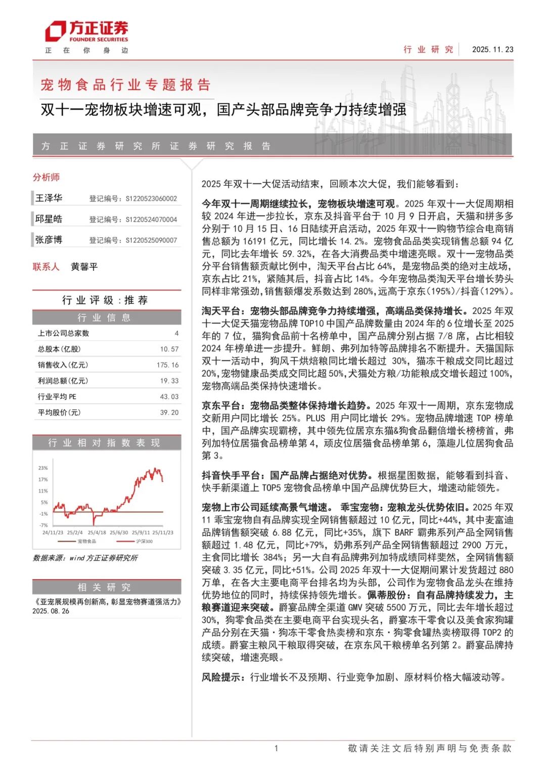 本文来自方正证券研究所于2025年11月23日发布的报告《双十一宠物板块增速可观,国产头部品牌竞争力持续增强》,欲了解具体内容,请阅读报告原文。