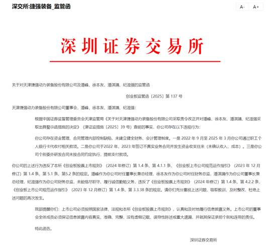 近期,捷强装备收到监管警示函,将公司的内控缺陷彻底暴露。11月19日晚,捷强装备公告称,公司收到天津证监局出具的行政监管措施决定书。公司存在资金管理、合同管理内部控制缺陷,未建立健全财务、会计管理制度。一是2022 年9 月至2025年3月公司通过职工个人银行卡代收付相关款项。二是公司于2022 年、2023 年签订不真实业务合同并发生资金收支往来(未确认收入、成本)。三是公司个别委外研发合同未按合同约定执行,提前支付款项。时任董事长、总经理潘峰、时任财务总监徐本友、公司董事长兼总经理潘淇靖、财务总监纪滋强被出具警示函。