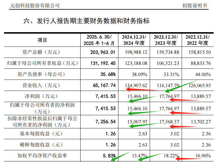 招股书注册稿信息显示,2022年、2023年、2024年和2025年1-6月(简称“报告期”),元创股份的营业收入分别为126,065.95万元、114,147.79万元、134,907.62万元和65,167.74万元;同期扣除非经常性损益前后孰低的净利润分别为13,702.27万元、17,568.57万元、15,007.97万元和7,256.54万元;同期加权平均净资产收益率分别为16.96%、18.22%、13.47%和5.83%。