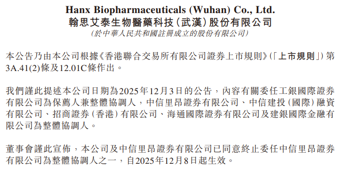 2025年12月8日,翰思艾泰生物科技(武汉)股份有限公司 Hanx Biopharmaceuticals (Wuhan) Co., Ltd.(以下简称“翰思艾泰”)公告,董事会宣布,公司及中信里昂证券有限公司已同意终止委任中信里昂证券有限公司为整体协调人之一,自2025年12月8日起生效。