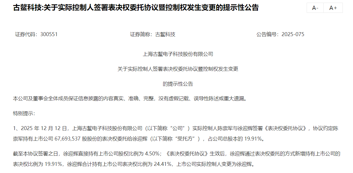 12月14日,古鳌科技公告称,公司实控人陈崇军将所持6769.35万股股份的表决权委托给徐迎辉行使。上述协议生效后,徐迎辉所持公司表决权比例达到24.41%。公司实控人变更为徐迎辉,股票自12月15日开市起复牌。