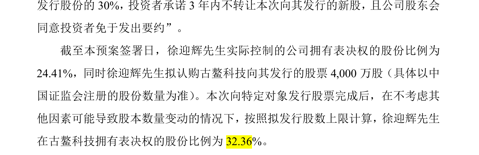 公告显示,本次向特定对象发行股票完成后,在不考虑其他因素可能导致股本数量变动的情况下,按照拟发行股数上限计算,徐迎辉在古鳌科技拥有表决权的股份比例为32.36%。