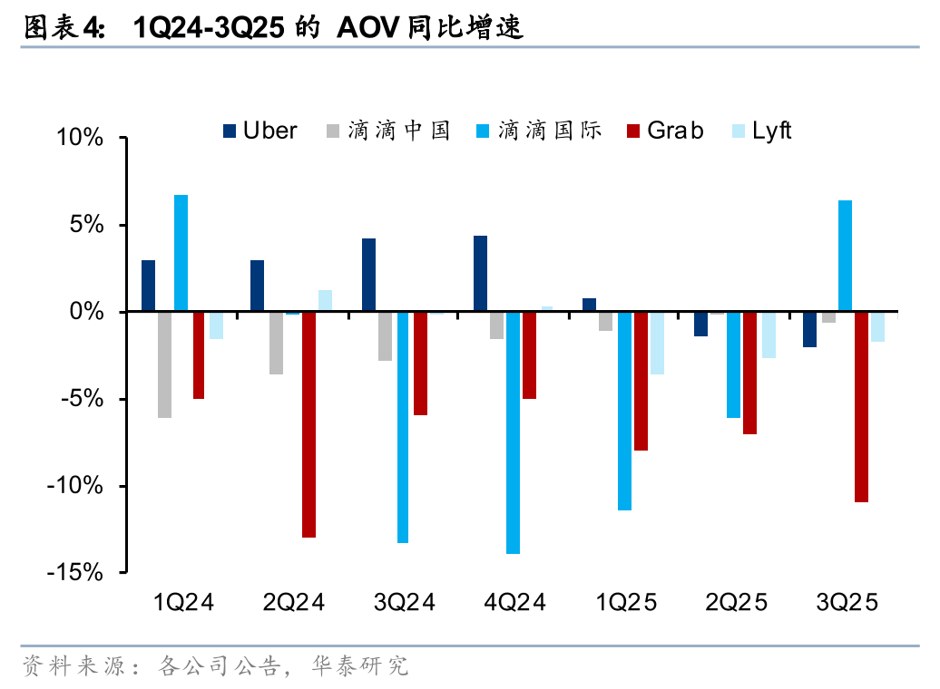 平台普遍以价换量,降低价格带拓展客群,其中Grab最显著。从GTV增长驱动的量价拆分看,1Q25-3Q25各平台AOV普遍同比下跌,主要平台均表现为以量换价,降低价格带以拓展客群。其中聚焦东南亚地区的Grab表现最显著,其订单增速显著高于GTV,1Q24-3Q25期间AOV平均约有5-6%的跌幅,主要是经济型产品占比持续提升带来的。中国以价换量集中发生在24年,滴滴的AOV自2Q24起转跌,至1Q25开始跌幅环比显著收窄,作为对比,而美国地区龙头则于25年才开启以价换量,24年间Uber AOV因通胀和保险成本显著抬升,进入2Q25因为保险成本缓解和经济型产品推出,AOV转为下跌趋势。核心业务在美国本土的Lyft表现和此类似。