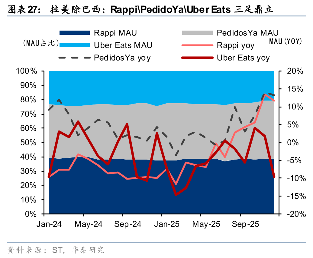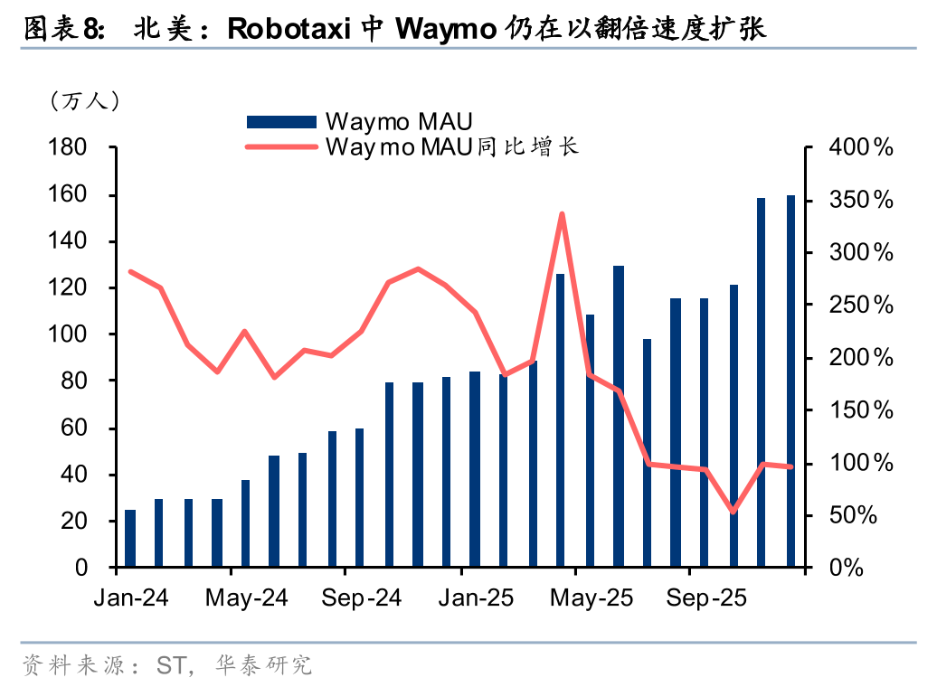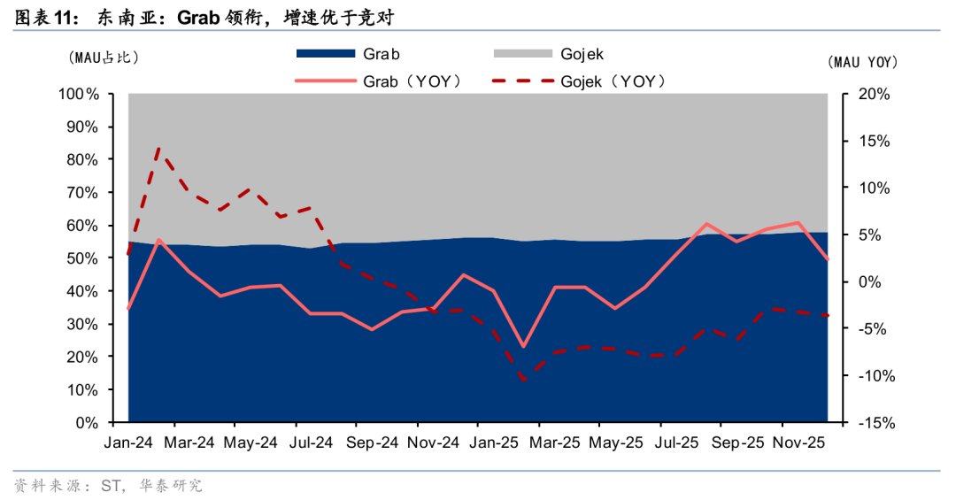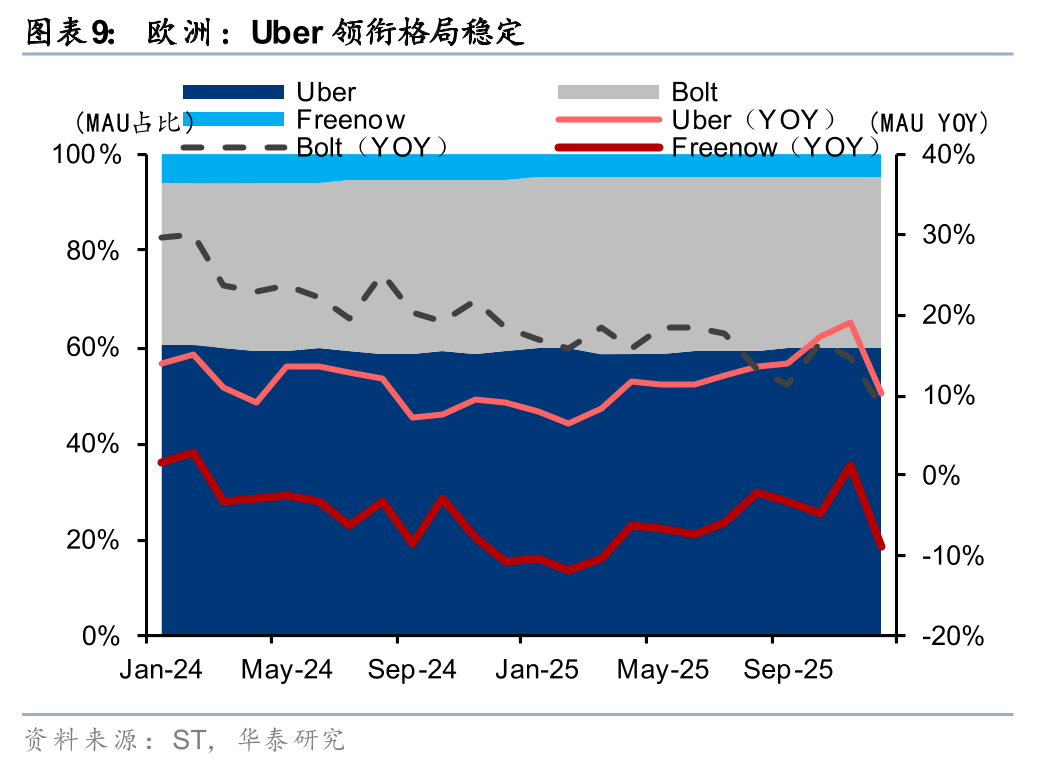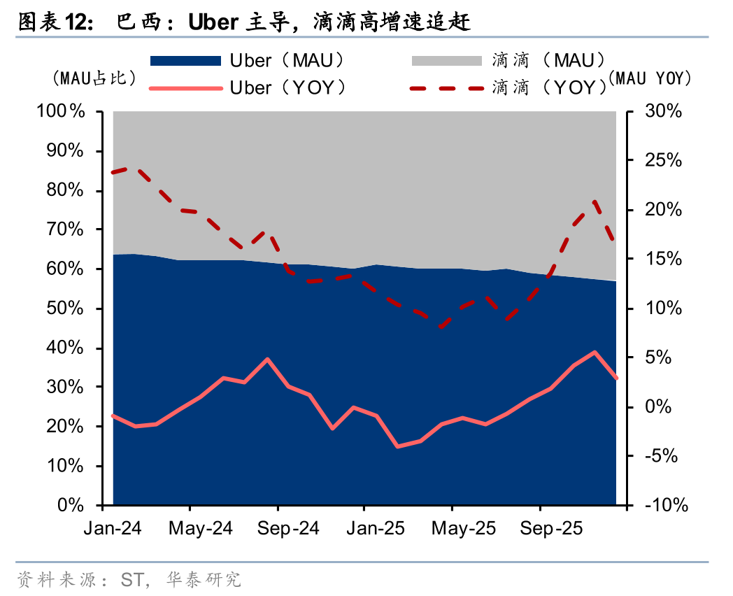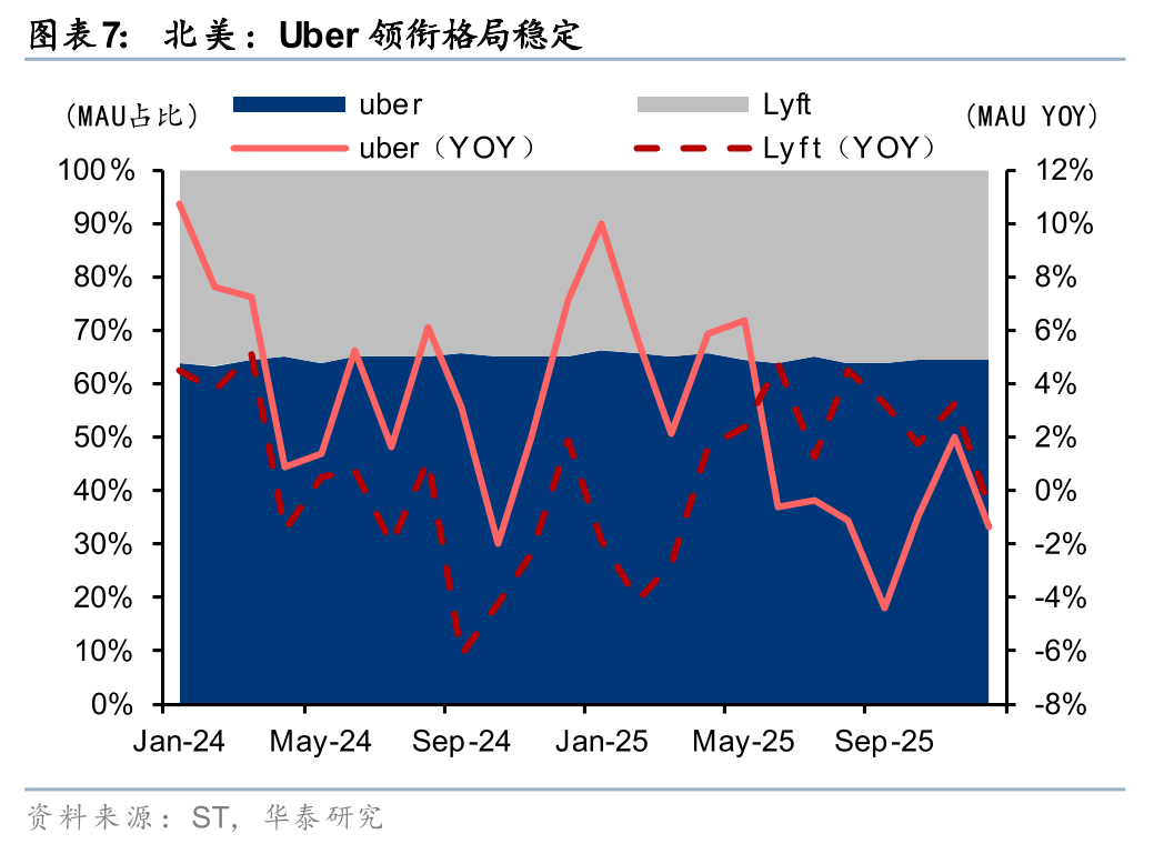 Uber、滴滴、Grab当前在各自利基市场龙头地位稳定,变量来自拉美市场和远期Robotaxi威胁。Uber(北美、欧洲)、Grab(东南亚)、滴滴(中国大陆)在各自的利基市场的龙头地位稳固。后续变量上,1、拉美地区滴滴和Uber竞争激烈,巴西地区Uber占优,但是滴滴增长迅速,根据ST数据用户维度上份额或有增加。非巴西地区滴滴用户体量领先,两方增速相近。2、北美地区Waymo仍以翻倍速度扩张,虽然当前体量较小,远期或对于Uber、Lyft产生威胁,还要看后续行业进展。