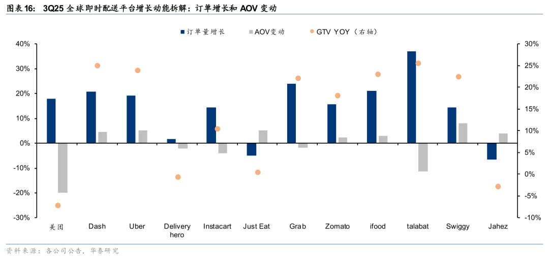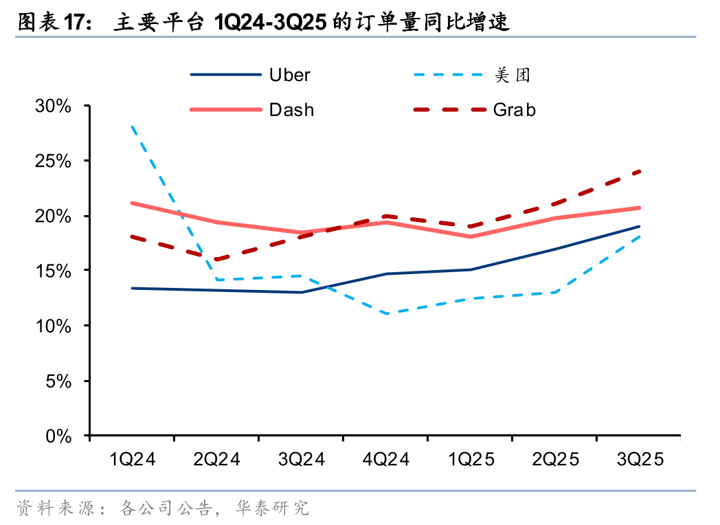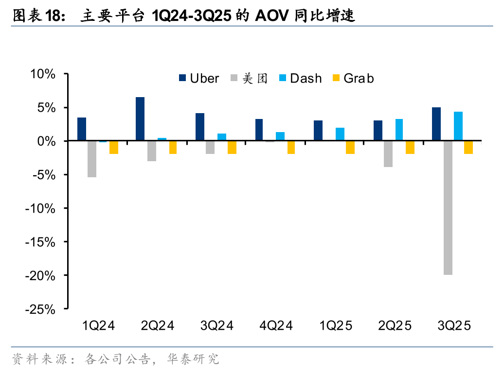 3Q25主要外卖平台订单增长均环比加速,北美两平台AOV增幅扩大。主要外卖平台的订单同比增长均环比有加速,美团(+5pct)>Grab(+3pct)>Uber(+2pct)>Dash(+1pct)。其中美团主因3Q是外卖竞争的补贴高峰,Grab、Uber和Dash则是景气度改善。AOV变动层面,北美两平台AOV增幅有扩大。
